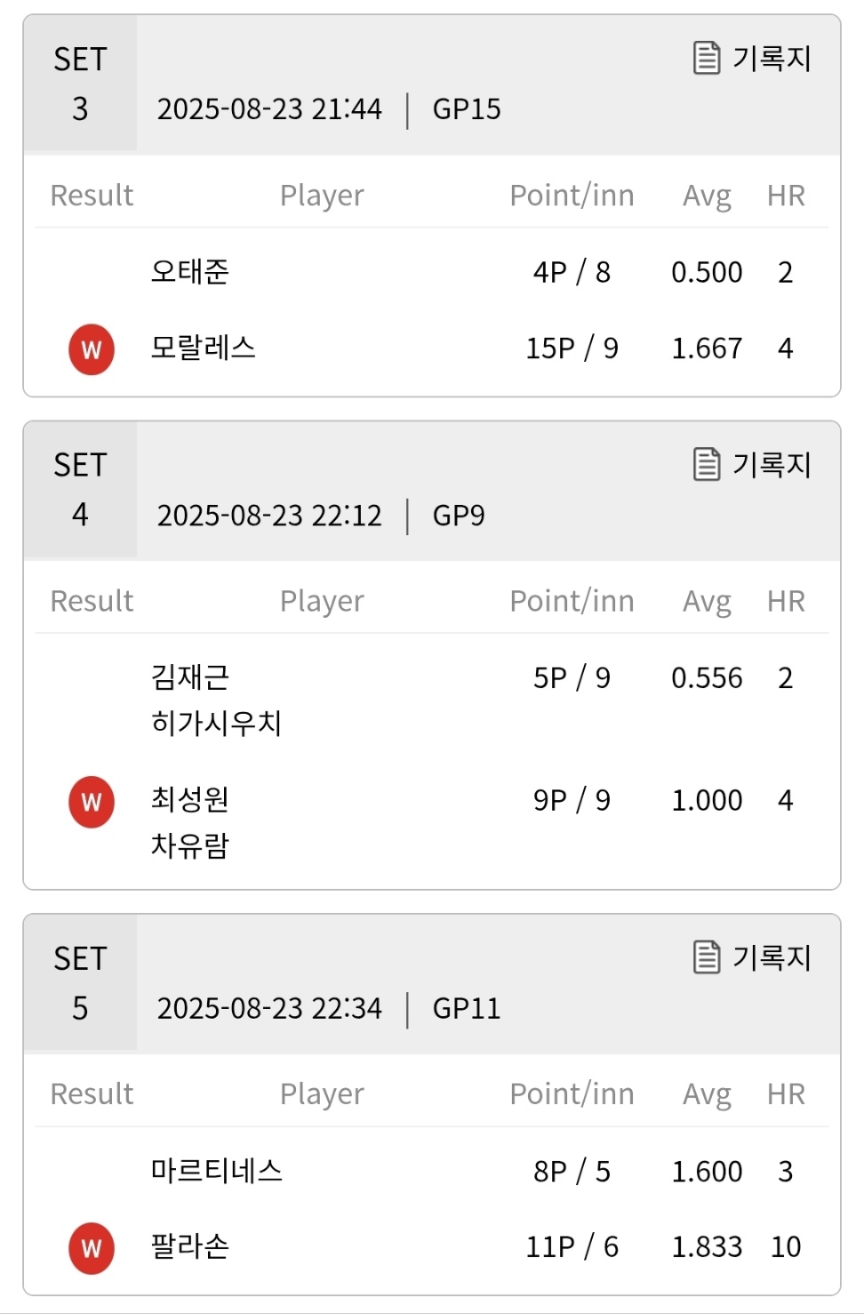 PBA 출범당시부터 프로당구에 합하며 한때 스페인 당구 3총사라 불리운 사파타, 마르티네스, 팔라손(팔라존)은 요사이 마르티네스를 제외하고는 다소 부진합니다. 하지만 오늘 경기에서는 팔라손이 이겼습니다. 단세트 경기이니 PBA 챔피언십과는 차이가 있습니다.