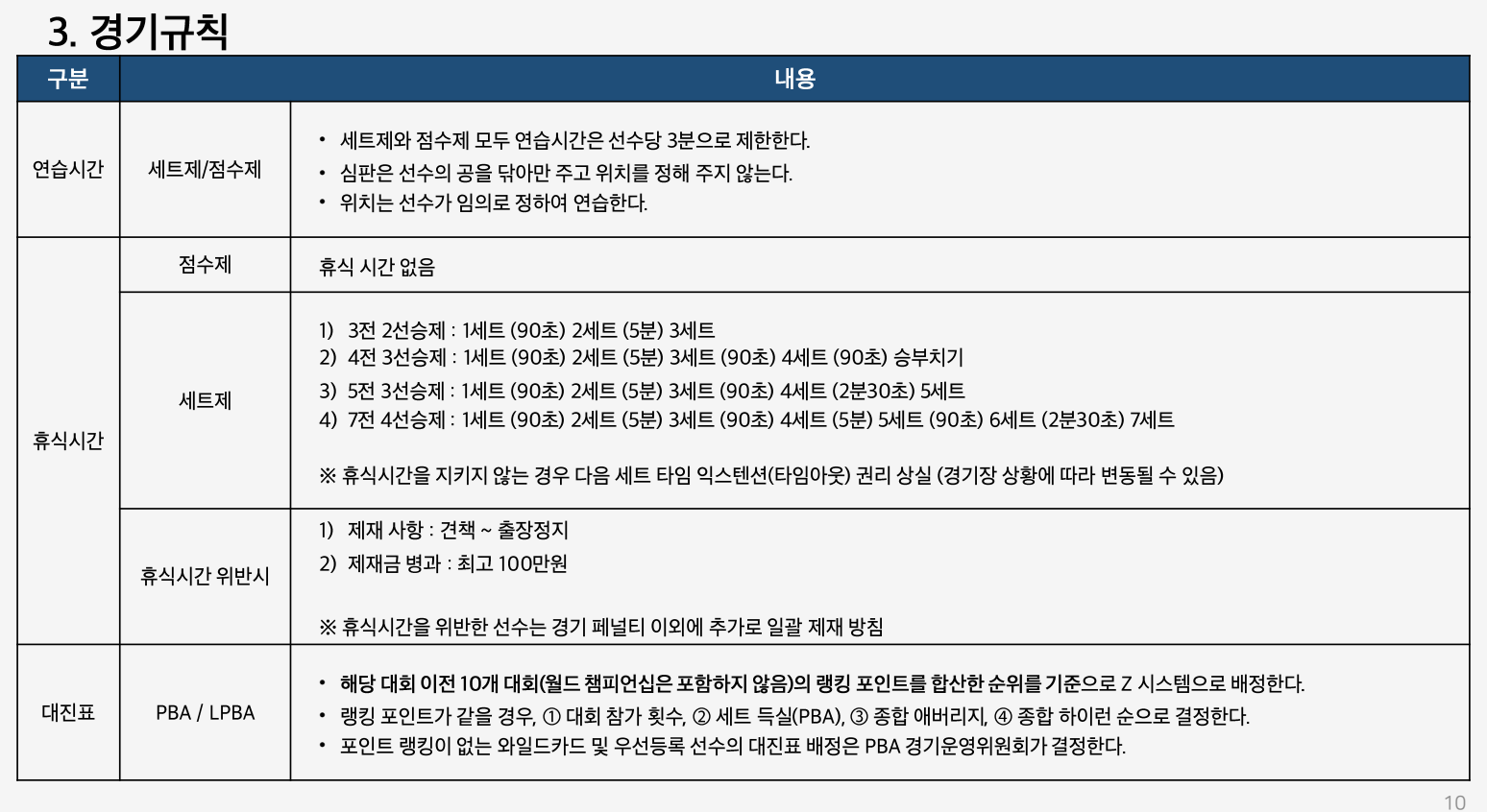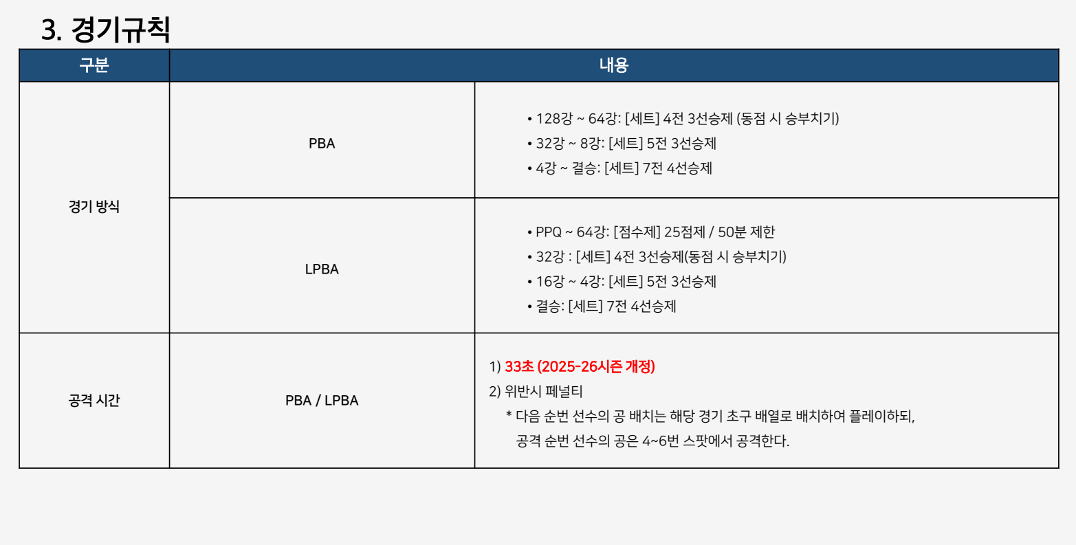 - 공격 시간: 2025-26시즌부터 PBA 및 LPBA 선수 모두 33초로 제한됩니다. 모든 선수에게 기본적으로 33초의 공격 시간이 주어지며, 타임아웃은 각 세트당 2회씩 사용할 수 있습니다. 또한, 지정된 시간 내에 샷을 하지 못하면 파울이 선언되며 다음 공격자에게 공이 넘어갑니다.