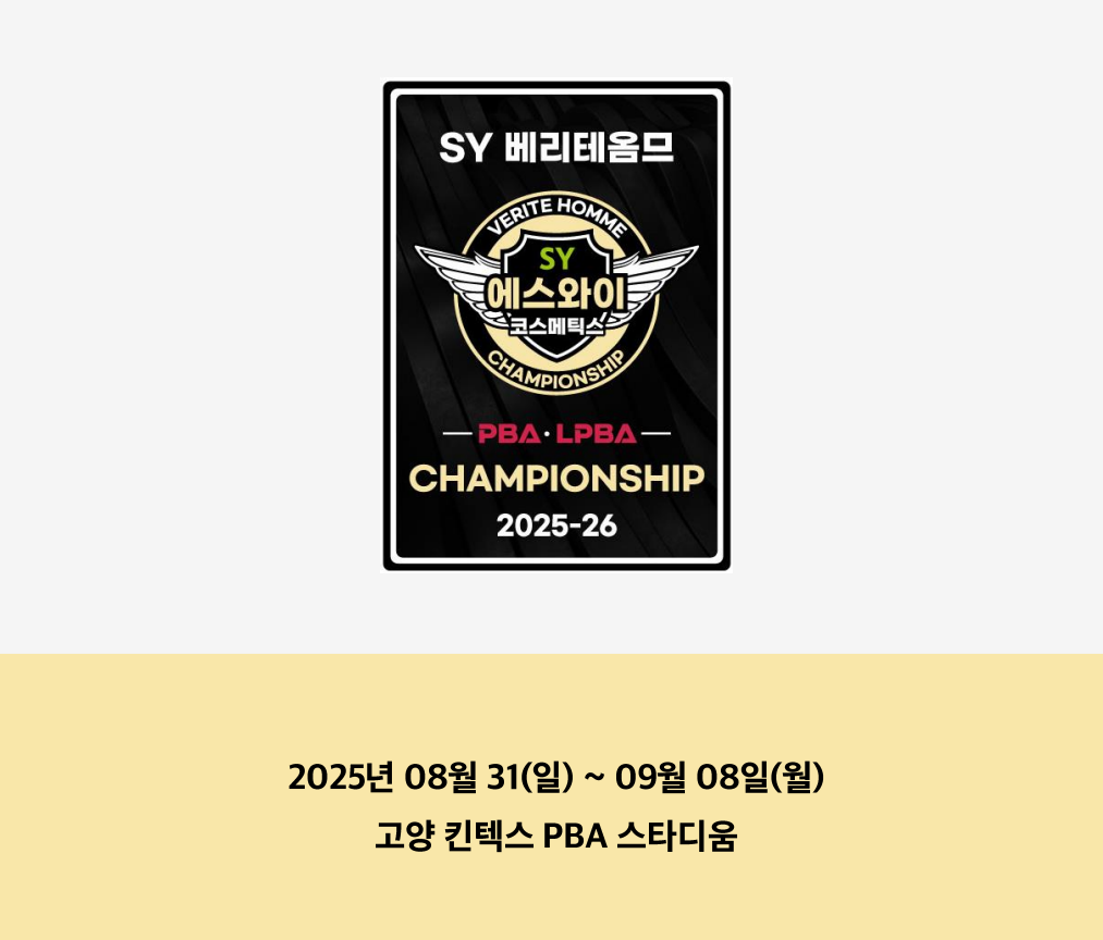 안녕하세요, 3쿠션 당구를 사랑하는 당구동호인 여러분, 또한 프로당구 경기를 즐기는 열정 당구팬 여러분! 오늘 8월 31일부터 프로당구 2025-26시즌 4차 대회에 해당하는 'SY 베리테옴므 PBA-LPBA 챔피언십'이 막을 올립니다. 당구 팬들의 뜨거운 기대를 한몸에 받고 있는 이번 대회의 모든 것을 자세히 알려드리고자 PBA 프로당구협회가 배포한 대회요강을 정리하였습니다.