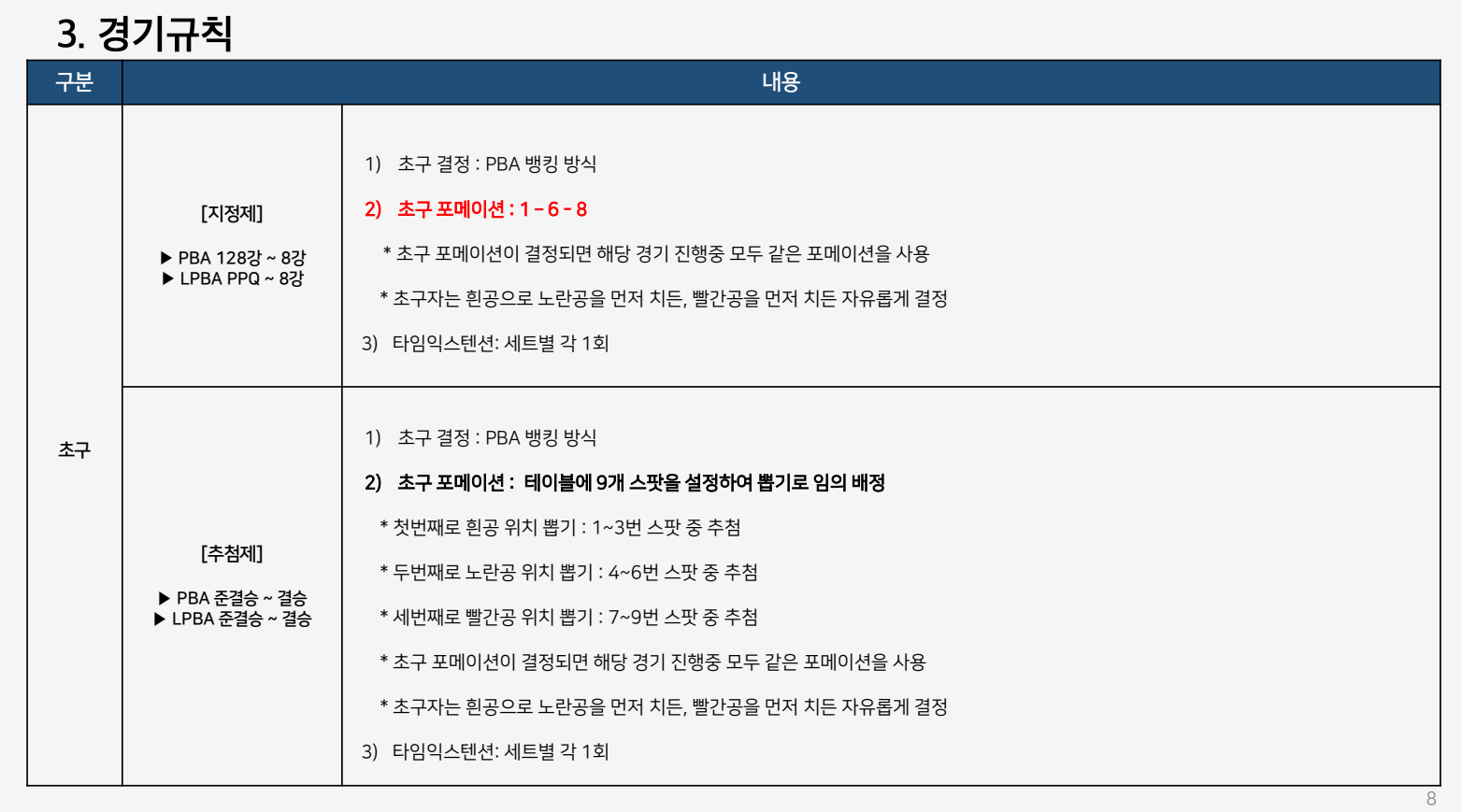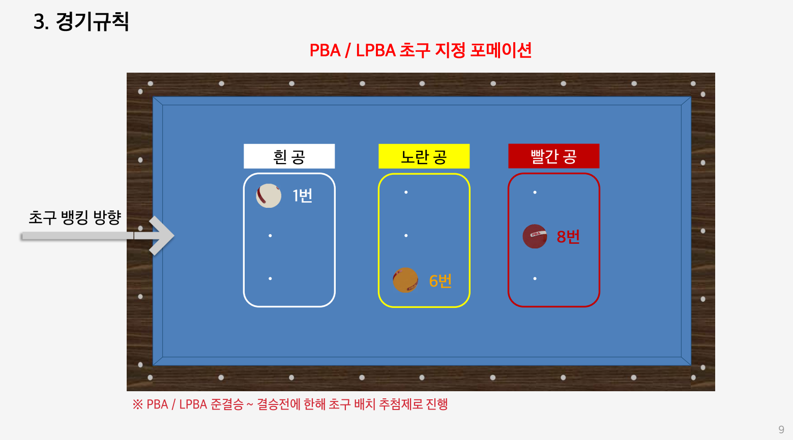 - 초구 방식: PBA 128강~8강과 LPBA PPQ~8강은 지정 포메이션(1-6-8)으로 진행됩니다. PBA/LPBA 준결승 및 결승전은 추첨제로 초구 배치를 결정하는 특별한 규칙이 적용됩니다. 이로써 예측 불가능한 초구 배치가 경기의 재미를 더할 것입니다. 또한, 모든 경기에서 첫 뱅크샷 득점은 2점으로 인정됩니다.