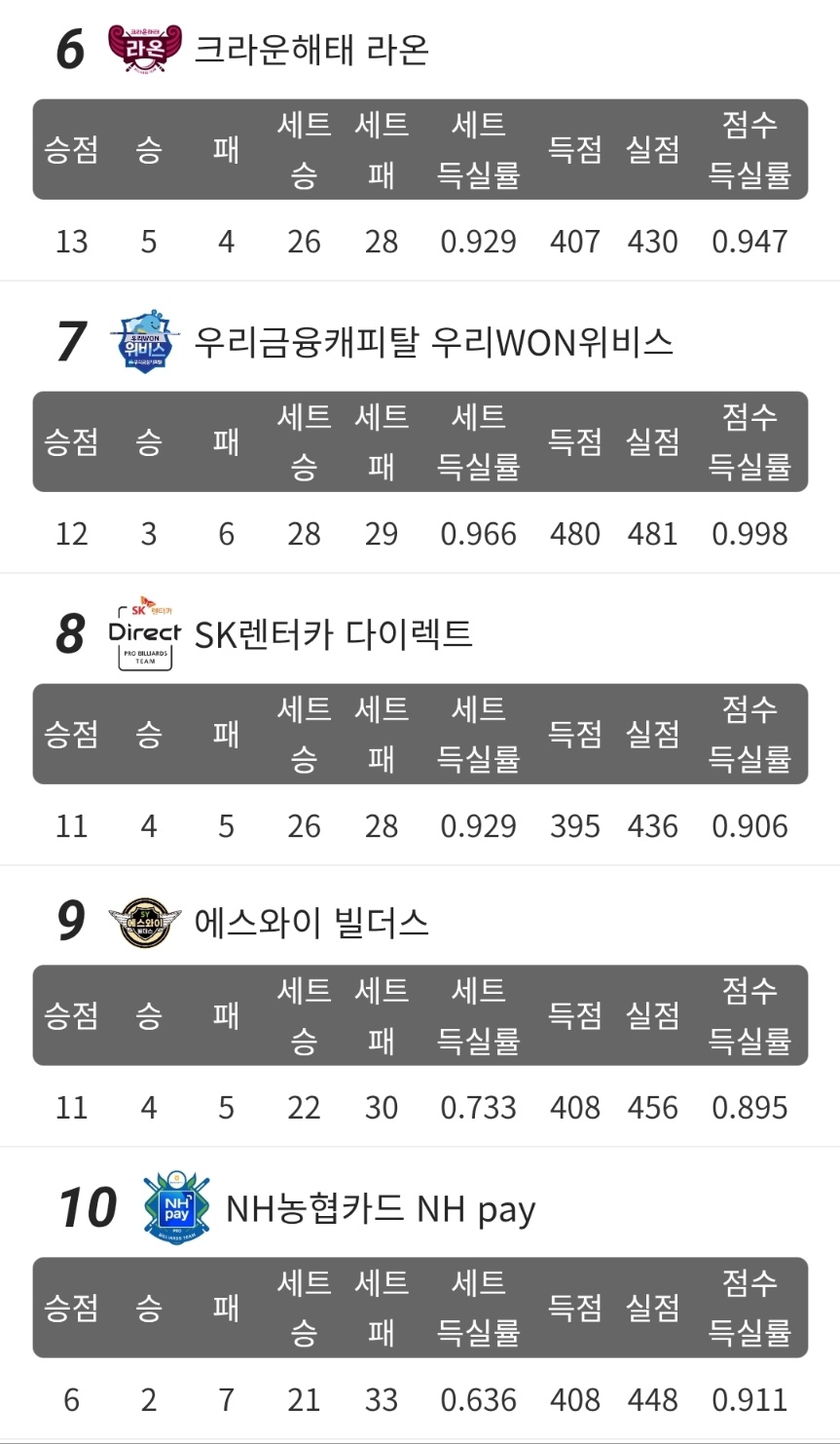 얼마전 당구팬 이웃임의 질문을 받았습니다. "팀리그 승패는 같은데 팀 순위가 다른 이유는 무엇인가요? 알고 싶습니다." 아하! 많은 분들이 모르고 계실 것 같아서 PBA팀리그에서 경기결과 순위