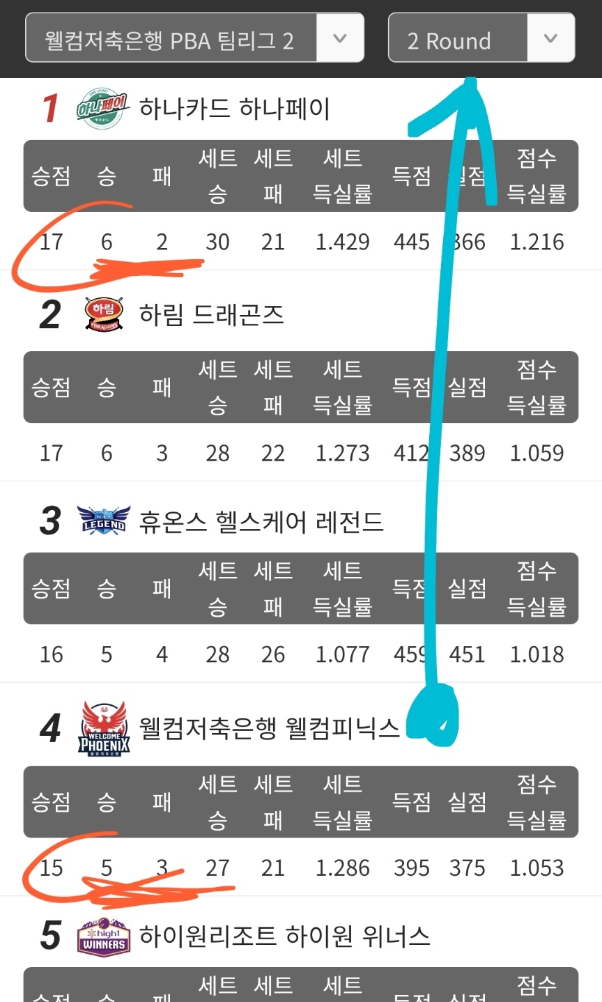 PBA팀리그 2라운드는 초박빙의 순위변화가 매일 매일 발생하면서, 하나카드 당구팀과 웰컴저축은행(웰컴) 당구팀은 8일차까지도 하나카드 당구팀이 줄곧 1위를 고수하면서 1라운드에 이은 2라운드 우승까지 할 가능성이 매우 컸습니다.