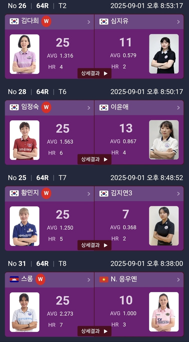 깜보디아 스롱 피아비는 베트남의 응우옌 호앙옌니 를 이겼습니다. 황미지는 김지연을 김다희는 심지유 선수를 이기고 32강에 진출하였습니다.