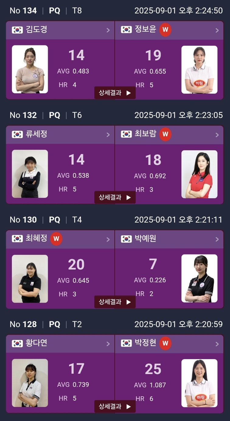 그럼 지금부터 우선 SY 베리테옴므 LPBA 챔피언십 PQ라운드와 64강 경기결과부터 먼저 보고, 32강 대진표를 살펴보겠습니다.