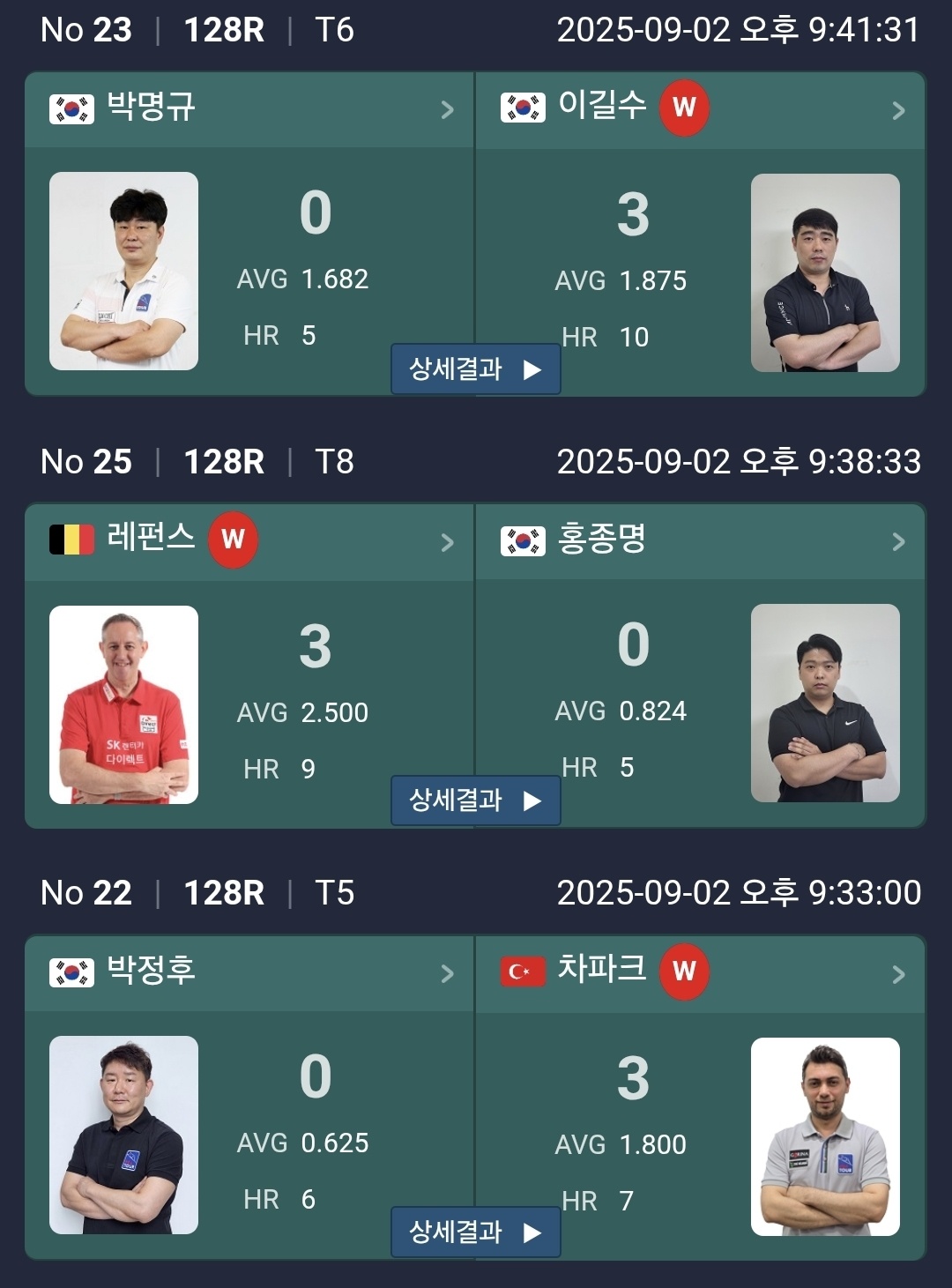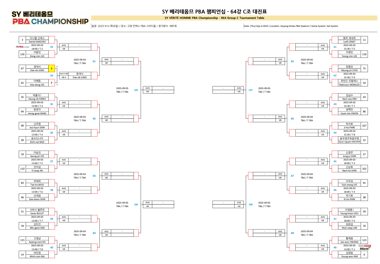 | SY 베리테옴므 PBA 챔피언십 64강 대진표 - 초클루 배정두, 산체스 정대식 (2025-26) (0) | 2025.09.04 |
