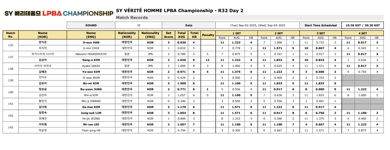 한편 SY 베리테옴므 LPBA 챔피언십 32강은 1차 예선전에 해당하는 PPQ라운드, 2차 예선전에 해당하는 PQ라운드 및 64강 경기를 거쳐 32강에 진출한 선수들 간의 경기로 9월 2일과 3일 양일에 걸쳐 경기가 진행되었습니다.