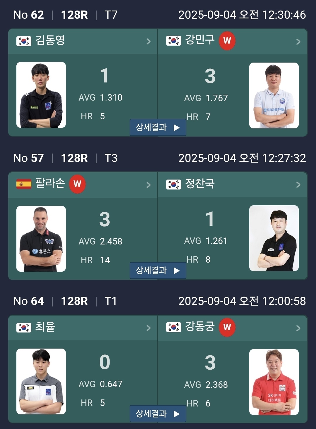 SY 베리테옴므 PBA 챔피언십 128강 2일차 주요 경기결과 입니다. 세미 사이그너, 다니엘 산체스, 하비에르 팔라손(팔라존) 등 PBA 챔프 출신 외국인이 진출하였습니다. 그런데 스페인 강호 다비드 사파타는 문성원 선수에게 일격을 당해서 탈락하였습니다.