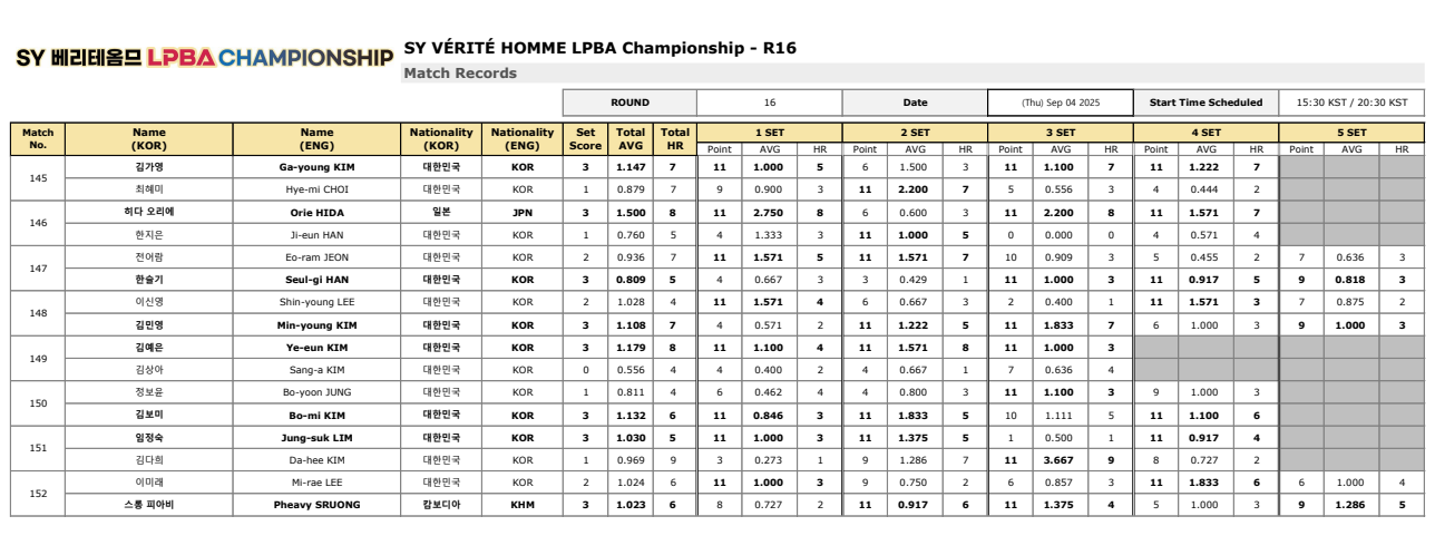 9월 4일 펼쳐진 SY 베리테옴므 LPBA 챔피언십 16강 경기 결과입니다. 김가영, 히다 오리에, 한슬기, 김민영, 스롱 피아비, 임정숙, 김보미, 김예은이 상대 5전 3선승제의 세트 경기에서 승리하고 8강 대진표에 이름을 올렸습니다.