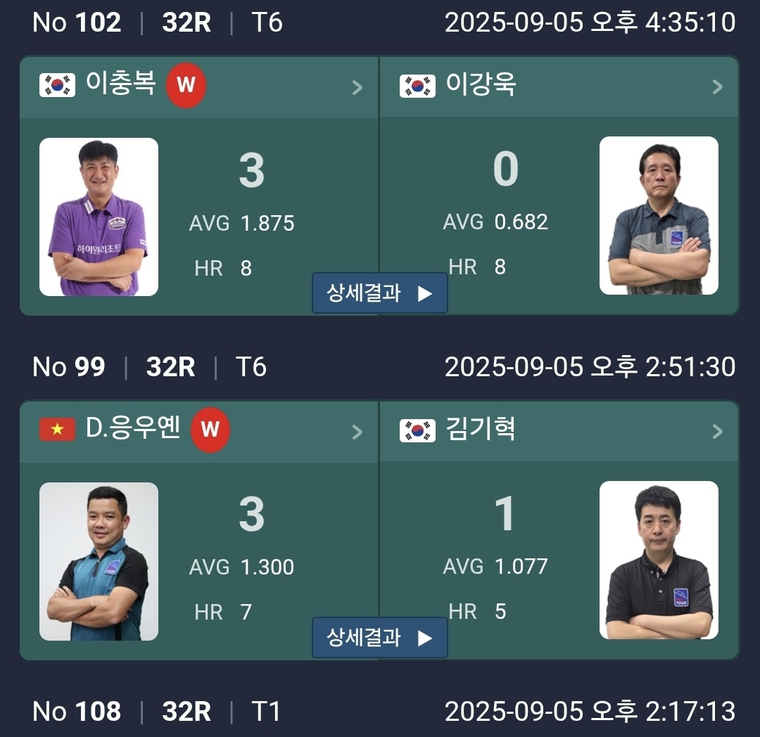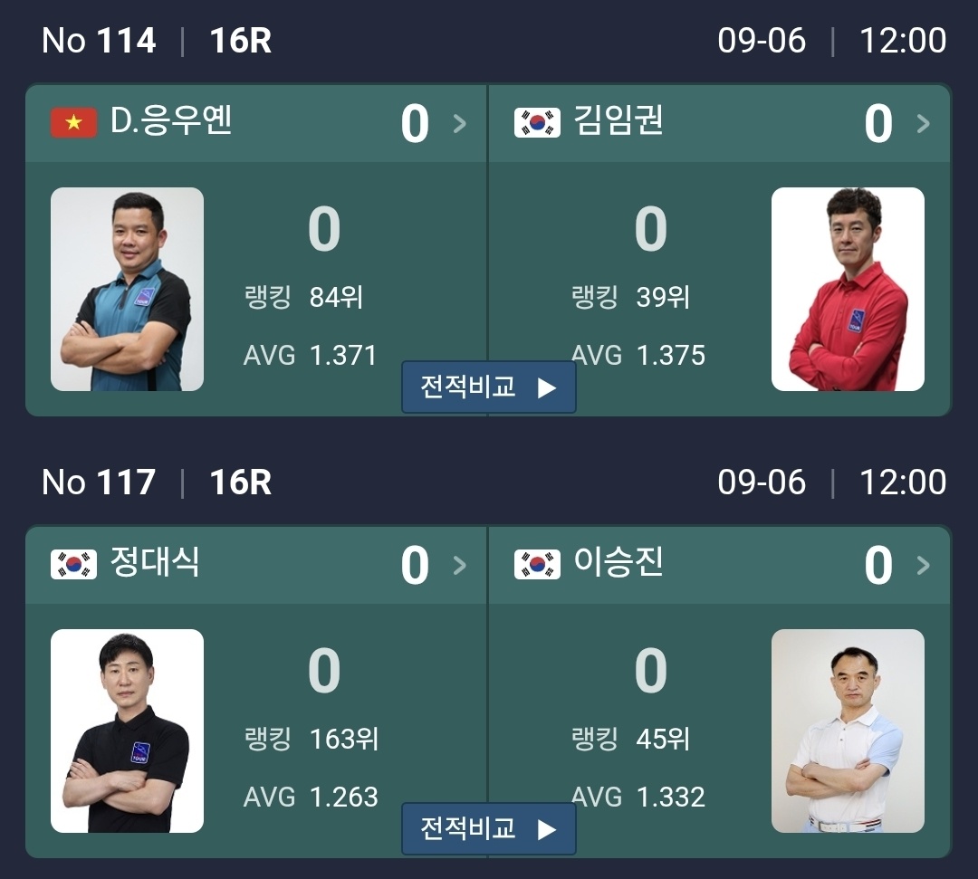 최성원 최원준, 이상대 김준태, 모랄레스 김영원의 매치에 주목이 됩니다. 이번대회에서 또 새로운 PBA 챔피언이 탄생할 수 있을까요? 이상대, 이충복이 강력한 후보입니다.