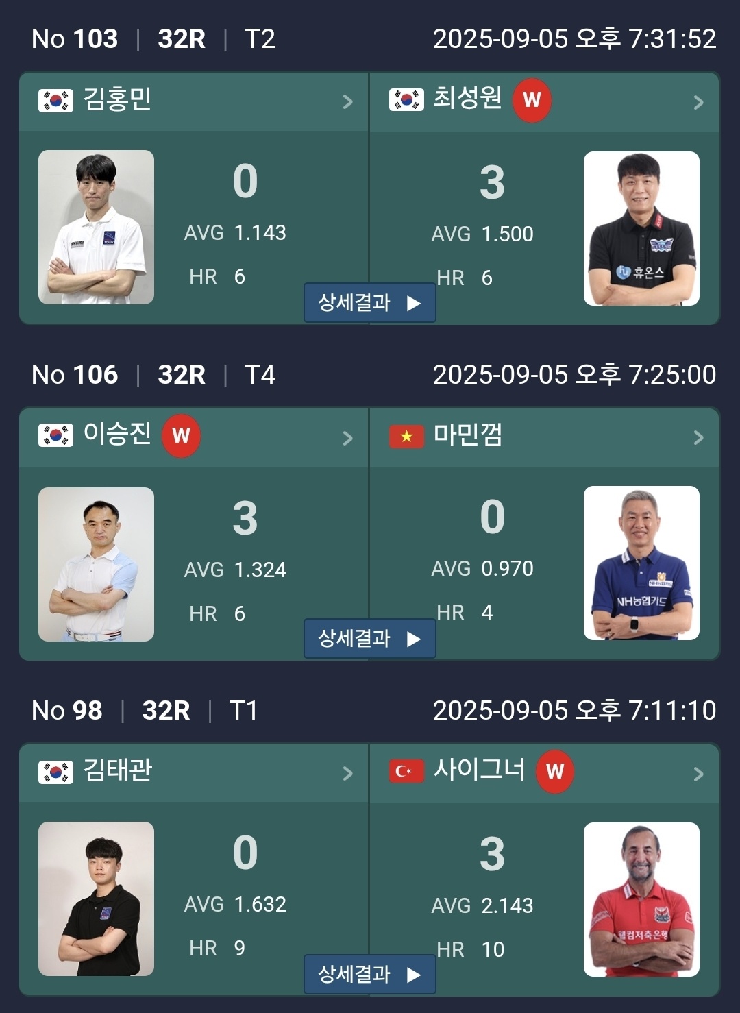 한편 스페인 당구선수도 최강호는 탈락하고 황득희를 꺽은 하비에르 팔라손과 로빈슨 모랄레스가 진출하였습니다. 김태관은 좋은 기세로 사이그너를 부수려했지만 매 세트 역전패를 당했습니다.
