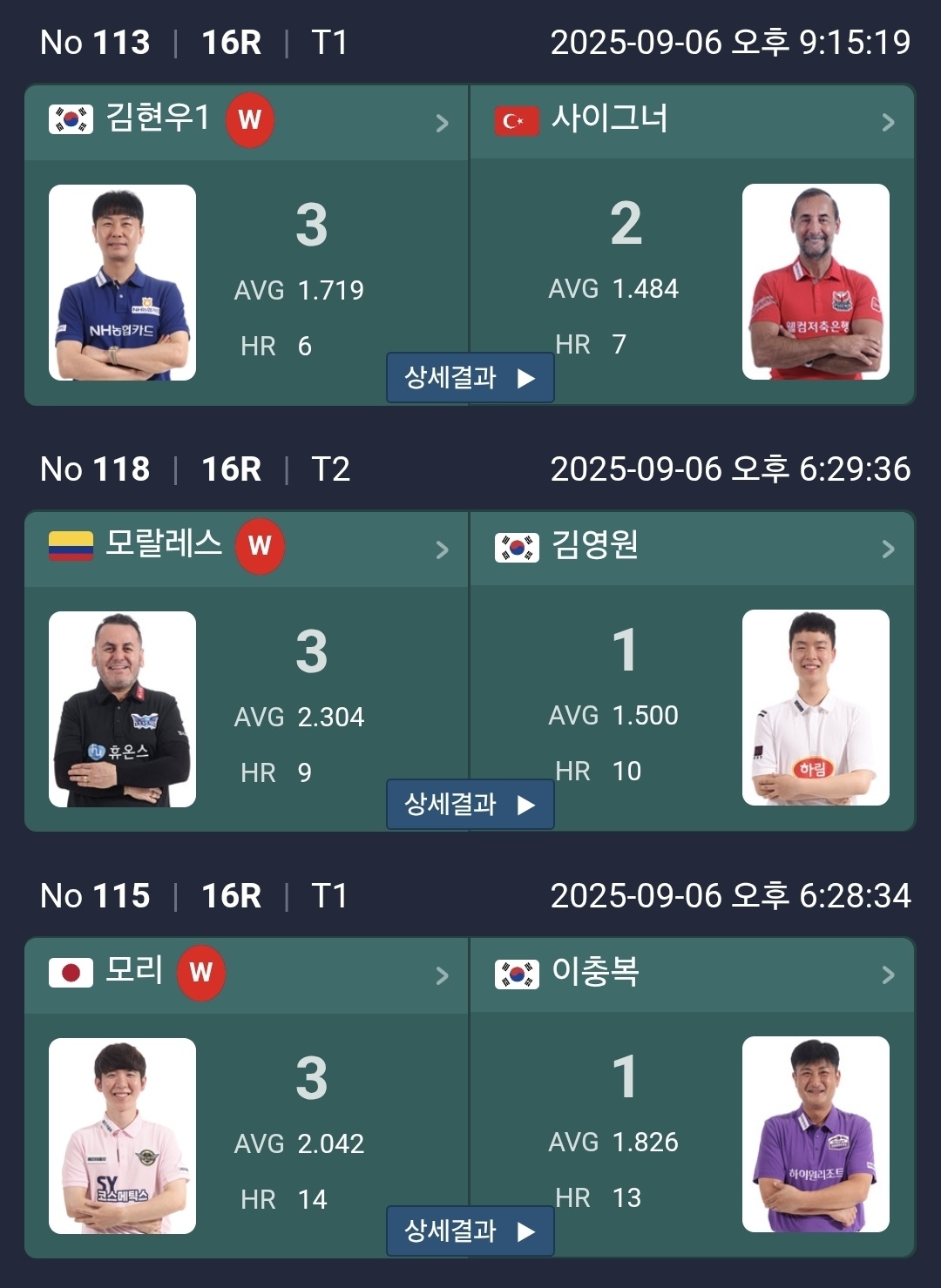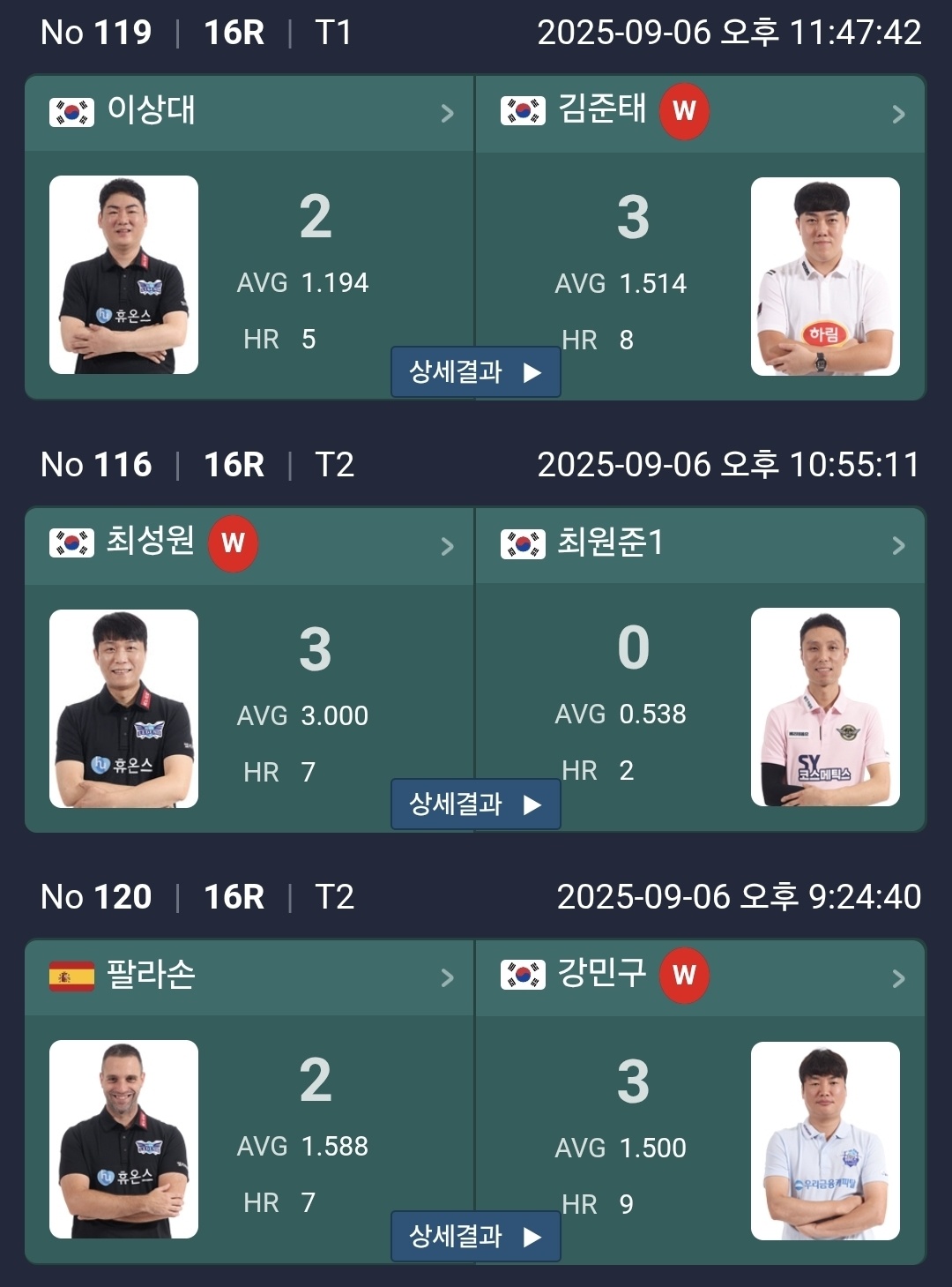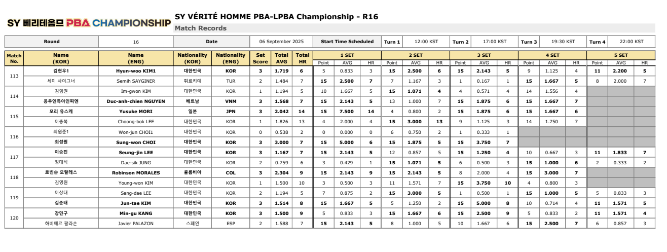 | SY 베리테옴므 PBA 챔피언십 16강 대진표 - 김현우 사이그너, 이충복 모리 (2025-26) (0) | 2025.09.06 |