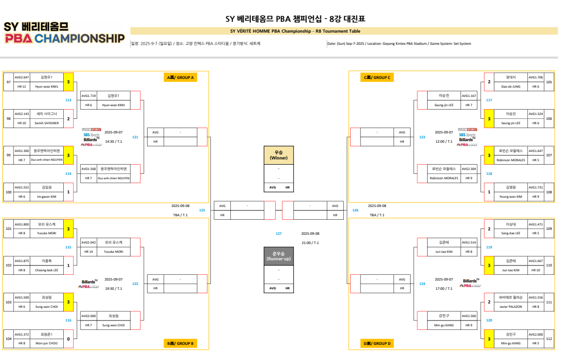 SY 베리테옴므 PBA 챔피언십 8강 경기는 9월 7일 입니다. 경기시간은 12시부터 19시 30분까지 나누어 펼쳐집니다. 중계방송은 대진표를 참고바랍니다.