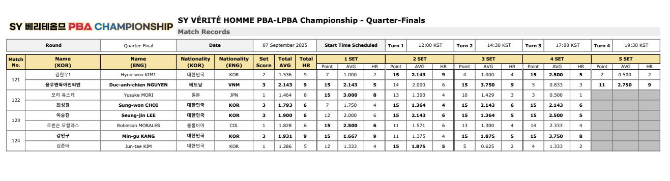 | SY 베리테옴므 PBA 챔피언십 8강 대진표 - 최성원 모리, 김준태 강민구, 이승진 모랄레스, 김현우 득아인찌엔(2025-26) (0) | 2025.09.07 |