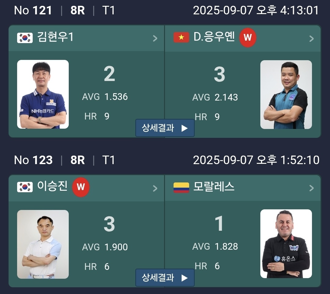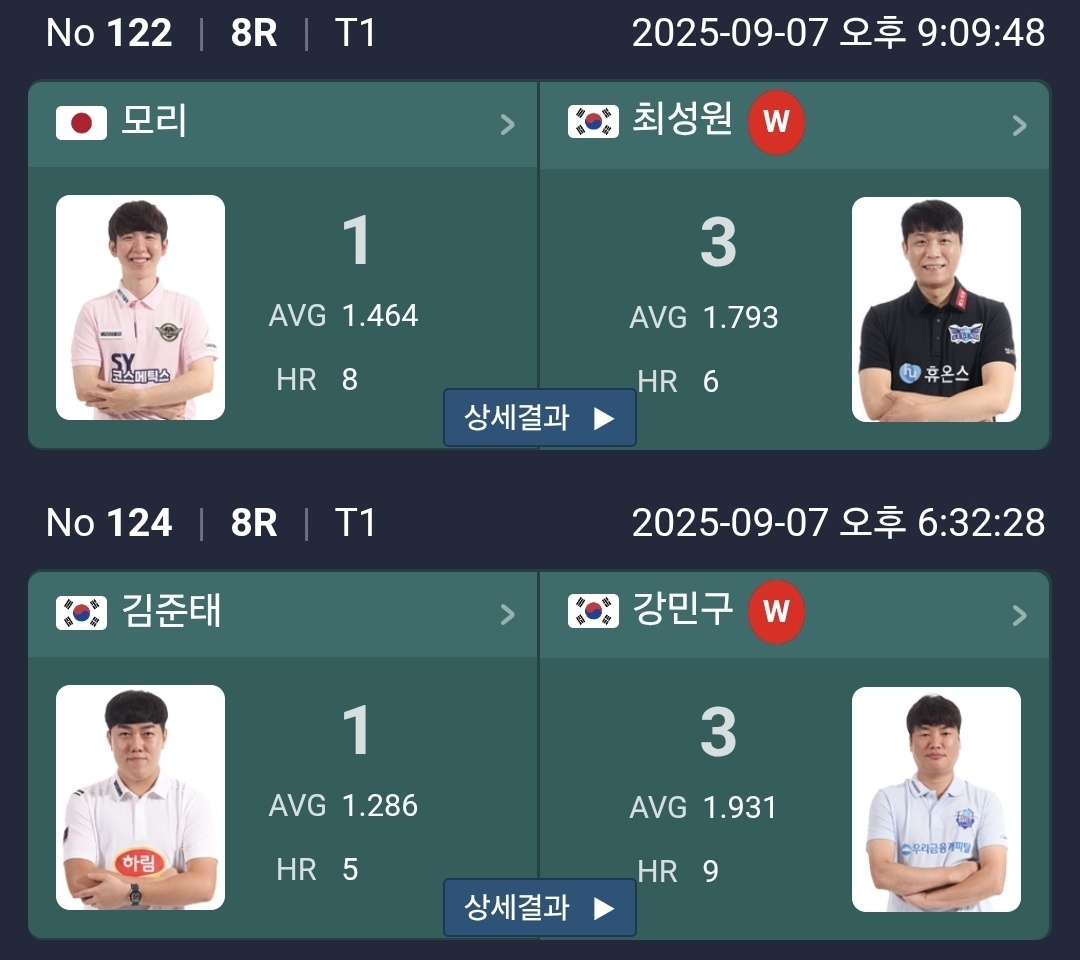 | SY 베리테옴므 PBA 챔피언십 16강 대진표 - 김현우 사이그너, 이충복 모리 (2025-26) (0) | 2025.09.06 |