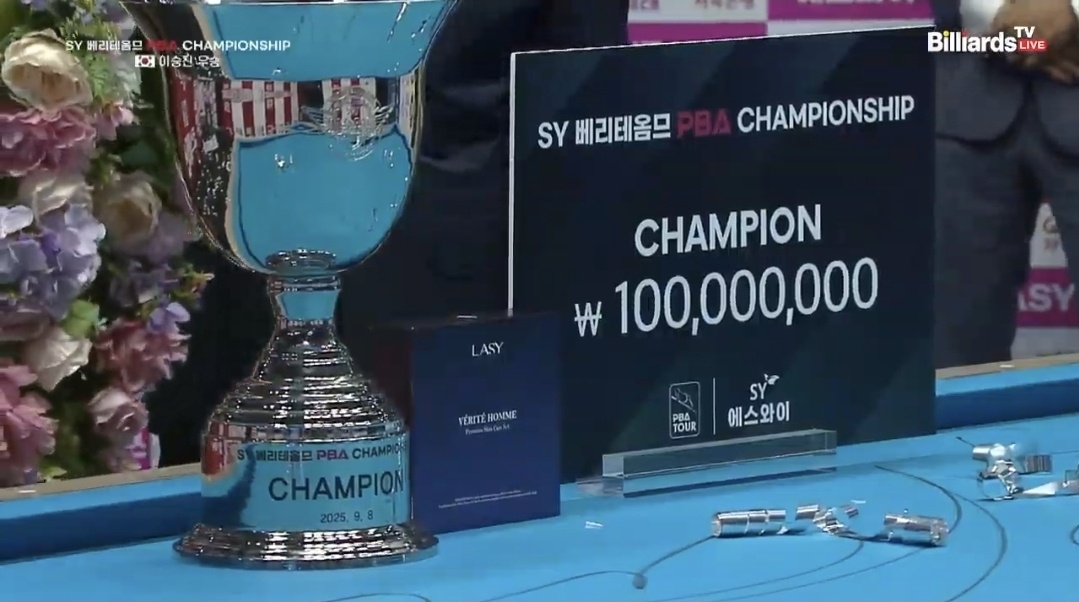 SY 베리테옴므 PBA 챔피언십 결승전 결과 우승자는 이승진, 준우승은 최성원입니다. 우승 상금은 1억원, 준우승 상금은 3400만원입니다. 두 선수 모두에게 축하의 박수를 보닙니다.