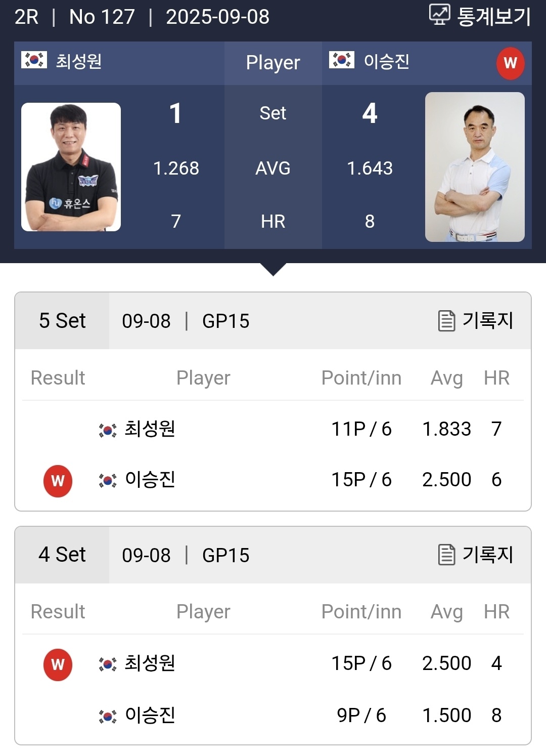 하지만 이승진 선수는 5세트에서 결판을 내려는 기세를 멈추지 않았고 최성원은 저지하려했습니다. 하지만 이승진은 마지막 매치 포인트를 3뱅크샷으로 장식하며 15:11로 7전 4선승제의 승부에 마침표를 찍었습니다.