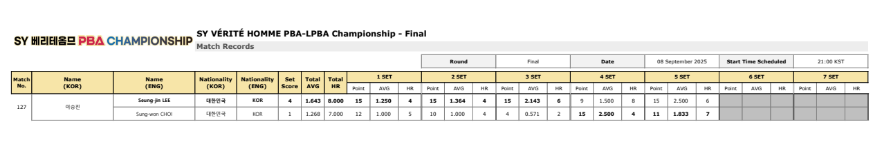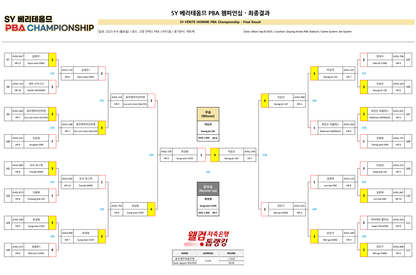| SY 베리테옴므 PBA 챔피언십 결승 대진표 - 최성원 vs 이승진(2025-26) (0) | 2025.09.08 |