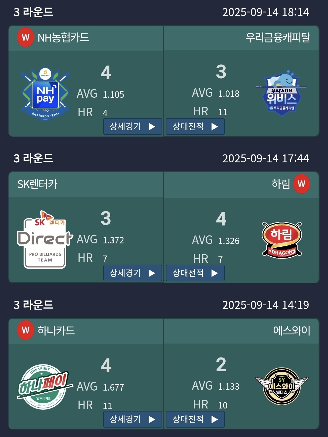 프로당구 2025-26시즌 3라운드 1일차 PBA 팀리그 경기결과의 당구팀간 주요 승패 현황입니다.
