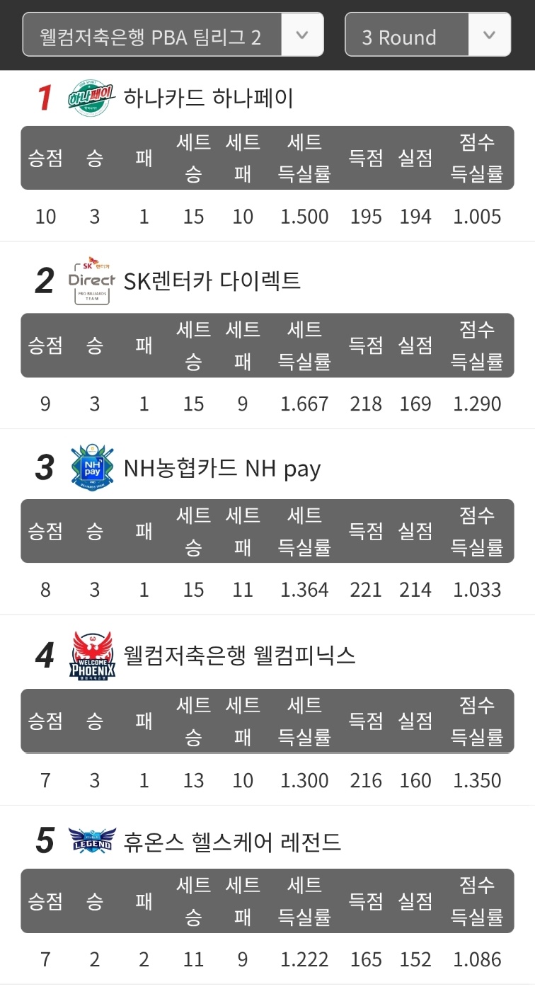 | PBA 팀리그 3라운드 6일차 순위 - NH농협카드 당구팀 상위권으로 도약(2025-26) (0) | 2025.09.20 |