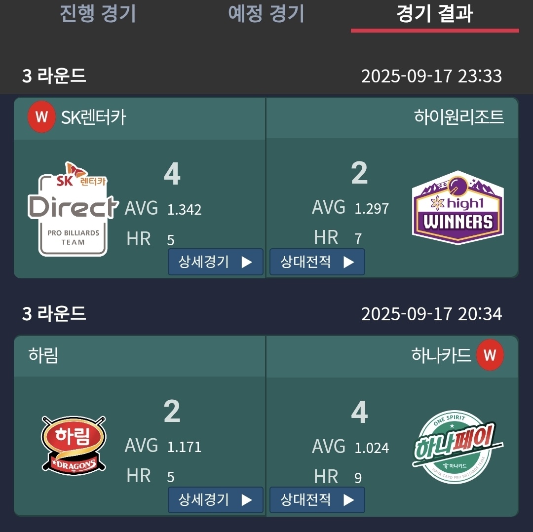| PBA 팀리그 3라운드 5일차 순위 - sk렌터카 당구팀 1위 올라 (2025-26) (0) | 2025.09.19 |