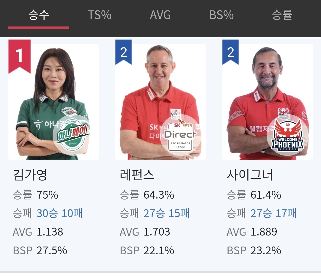 PBA팀리그 1라운드 우승팀은 김가영, 초클루가 활약하는 하나카드 당구팀입니다. 하나카드는 1라운드부터 탁월한 경기력으로 정규리승 우승이 유렵합니다. 한편 조재호, 강동궁이 이끄는 팀은 이전과 달리 하위권입니다. 3라운드 암은 경기에서 상승이 가능할까요?
