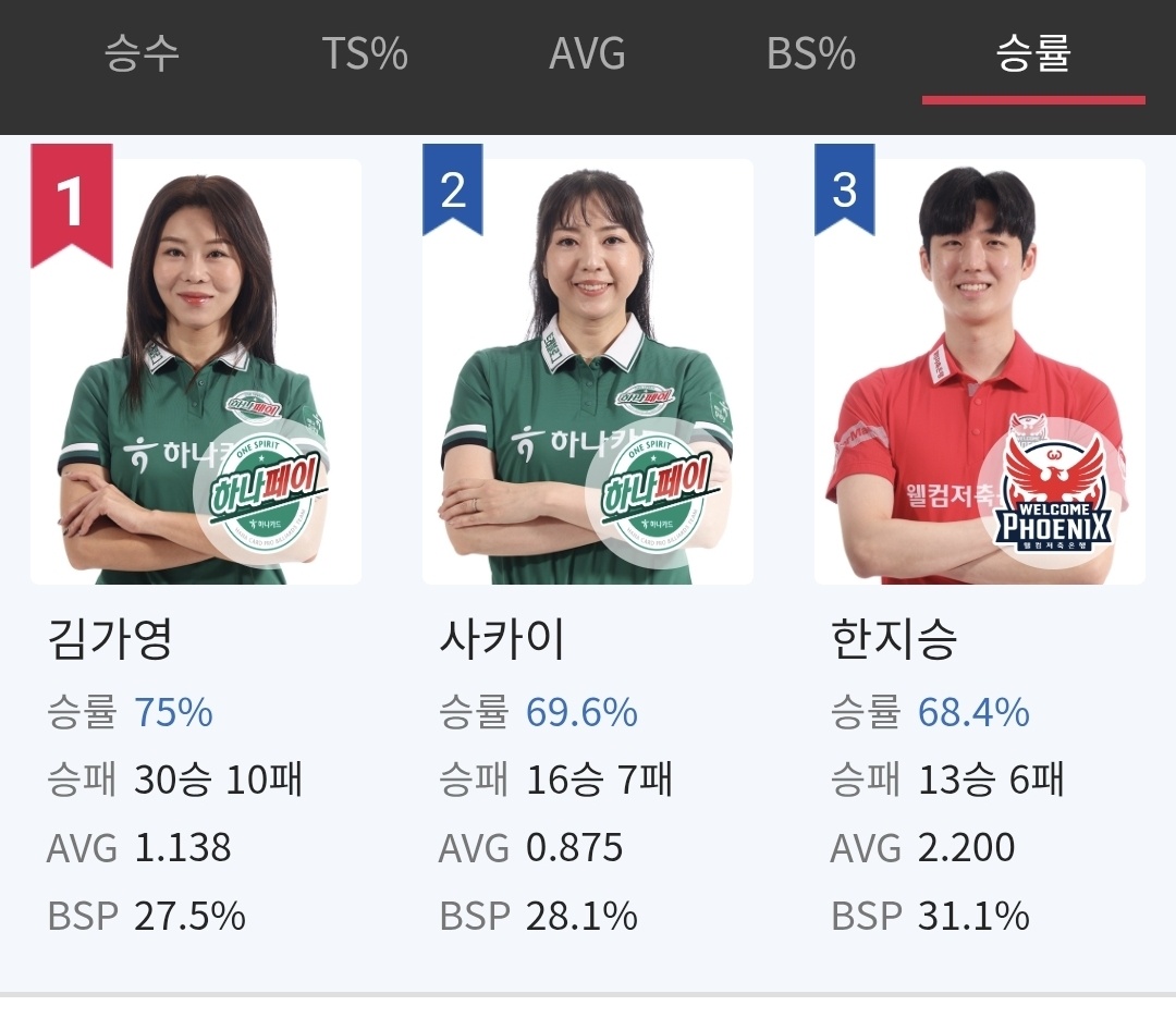 한편 3라운드 2일차까지 정규리그 현재 승률 1위를 기록하고 있는 당구선수도 김가영입니다. 김가영은 승률 75%를 기록하며 다른 선수보다 압도적입니다. 2위는 일본 당구선수 사카이 아야코 입니다. 3위는 정수빈의 남친으로 알려진 한지승 당구선수입니다. 깜보디아 출신으로 가끔 김기영 라이벌로 거론되는 스롱 피아비의 이름은 아예 보이지 않습니다.