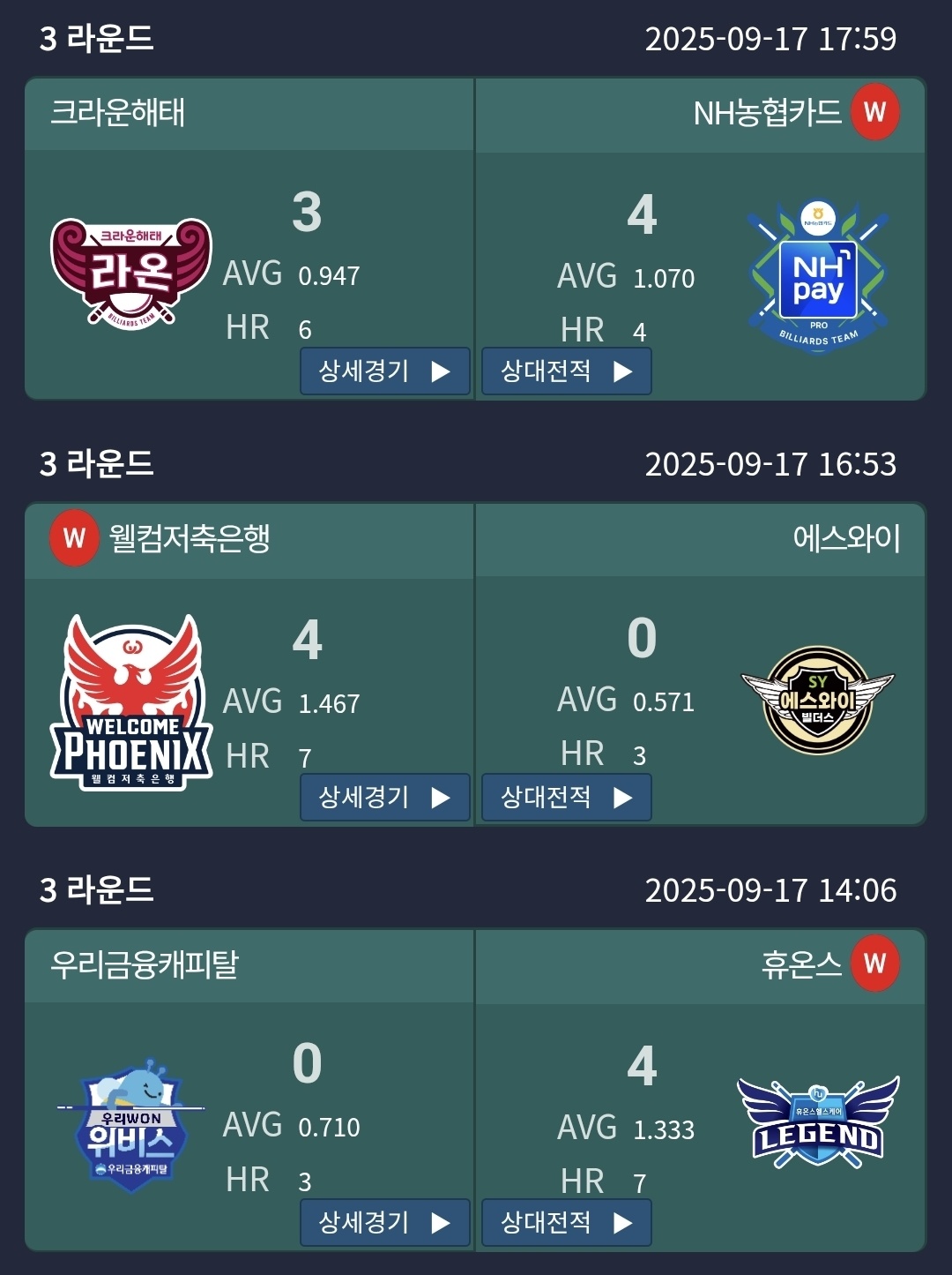 | PBA 팀리그 3라운드 3일차 경기결과 순위 - 하림 당구팀, NH농협카드 연승 막아세워 (2025-26) (0) | 2025.09.17 |
