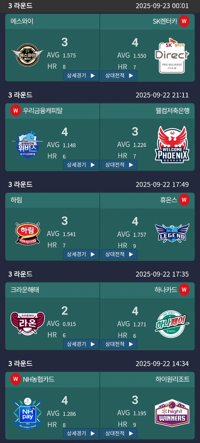 | PBA 팀리그 4라운드 1일차 – SK렌터카 다이렉트 vs 우리금융캐피탈 당구팀 경기결과 (2025-26) (0) | 2025.11.17 |