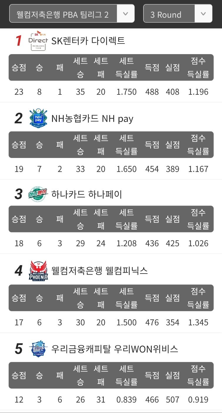 | PBA 팀리그 3라운드 5일차 순위 - sk렌터카 당구팀 1위 올라 (2025-26) (0) | 2025.09.19 |
