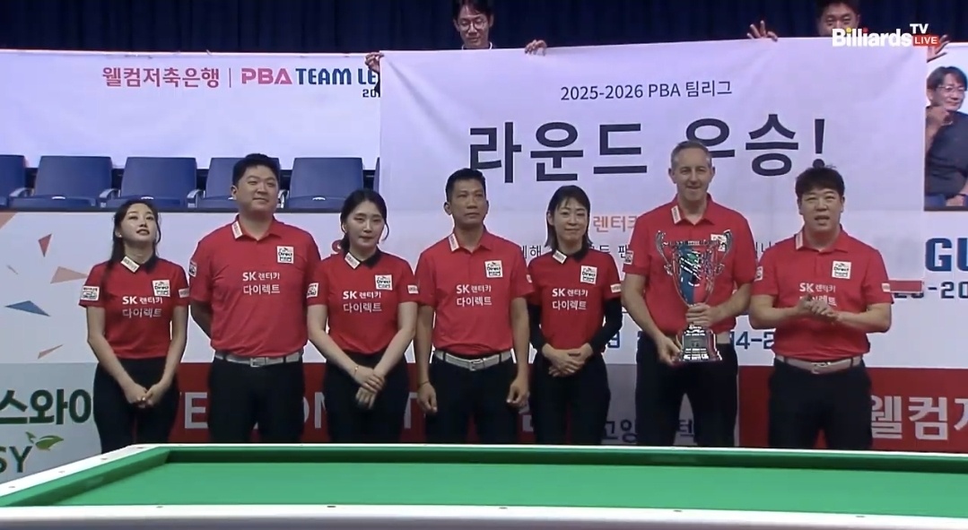 PBA팀리그 2라운드 우승팀은 다니엘 산체스와 세미 사이그너가 있는 웰컴저축은행 당구팀입니다.