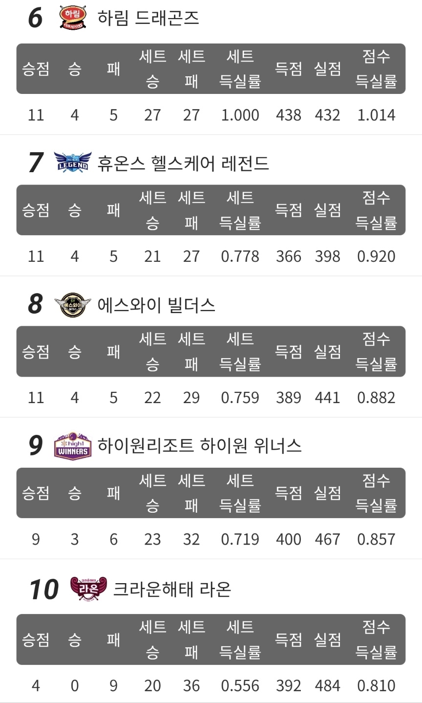 6위, 7위, 8위는 모두 4승 5패로 승점이 11점으로 동일하지만 세트 득실에서 순위가 갈렸습니다. 김준태가 주장인 하림 당구팀이 6위, 최성원이 팀리더로 있는 휴온스 당구팀이 7위, 황득희 선수가 이끄는 에스와이 당구팀이 8위를 차지하였습니다.
