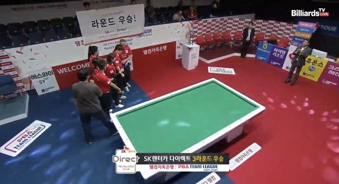 프로당구 2025-2026시즌 PBA 팀리그 3라운드 우승팀은 SK렌터카 당구팀으로 확정 되었습니다. SK렌터카 당구팀은 3라운드 9개 경기 가운데 첫 경기를 제외한 나머지 8개 경기를 모두 승리하는 엄청난 집중력을 보여주었습니다.