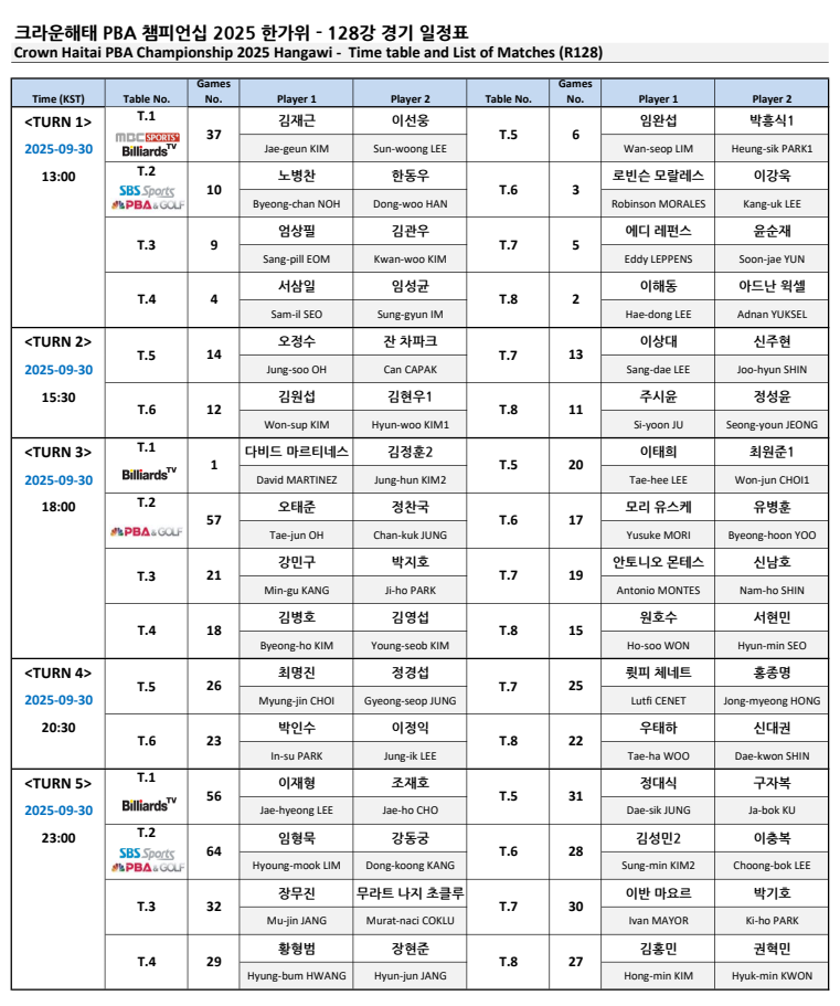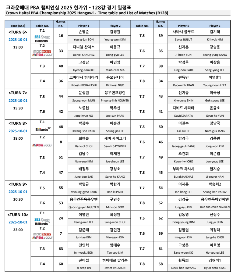 크라운해태 PBA 챔피언십 2025 한가위 챔피언십 128강 경기 일정