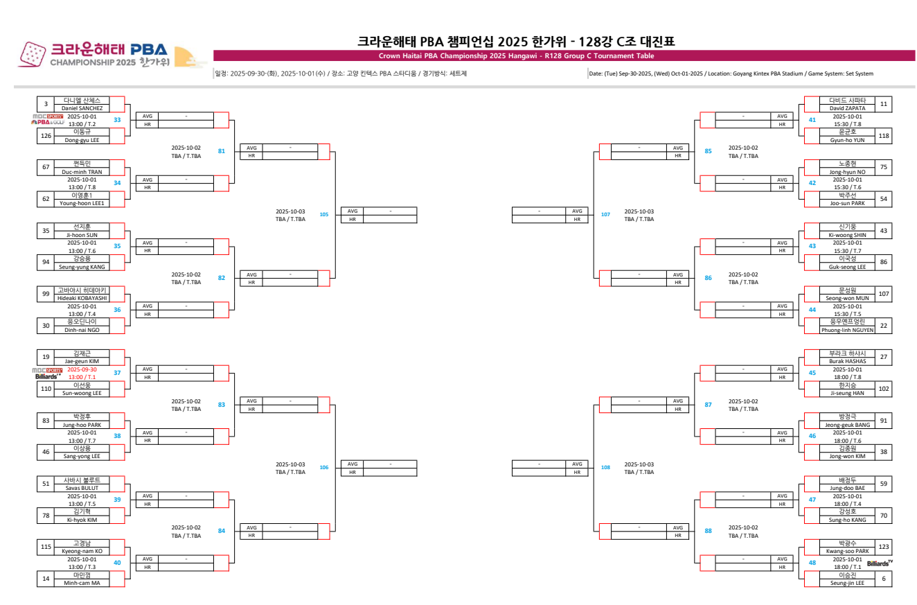 크라운해태 PBA 챔피언십 2025 한가위 챔피언십 128강 C조 대진표