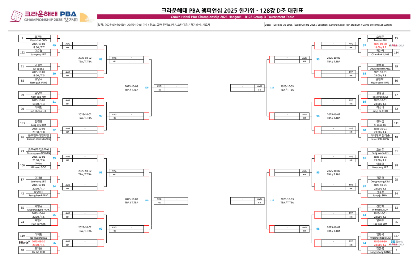 크라운해태 PBA 챔피언십 2025 한가위 챔피언십 128강 D조 대진표