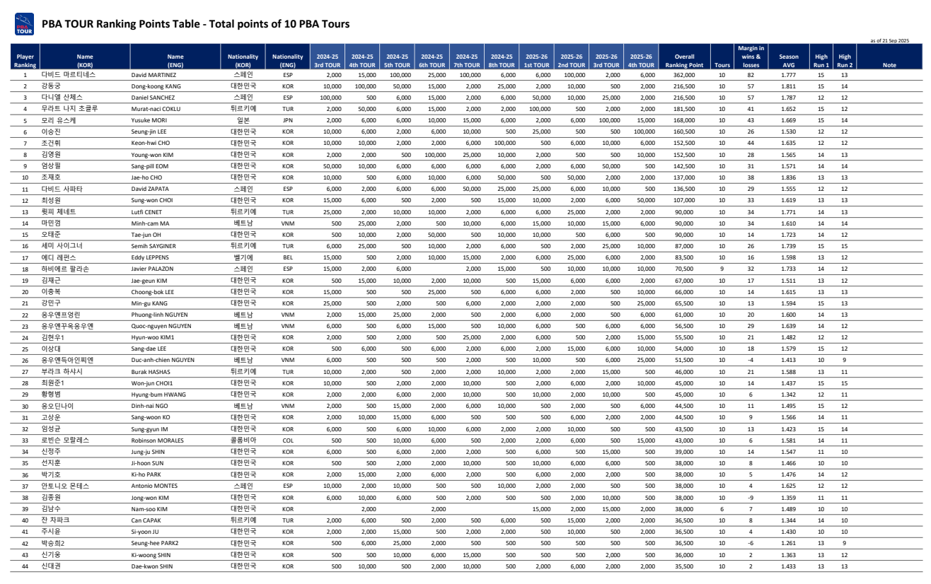 2025-26시즌 PBA TOUR 합산 포인트 랭킹표(10개 대회)에 따르면, 랭킹 1위는 마르티네스, 2위는 강동궁, 3위는 다니엘 산체스, 4위는 초클루, 5위는 모리 유스케입니다. 일곱시즌 누적 PBA 상금 랭킹과는 1위를 제외하고는 차이가 있지만 상당한 변화라 할 수 있습니다.