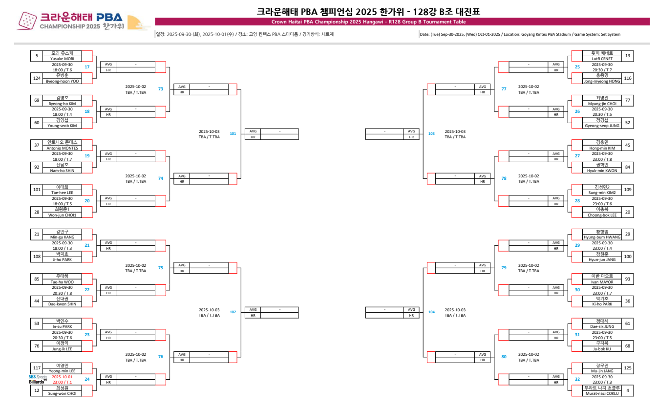 크라운해태 PBA 챔피언십 2025 한가위 챔피언십 128강 B조 대진표