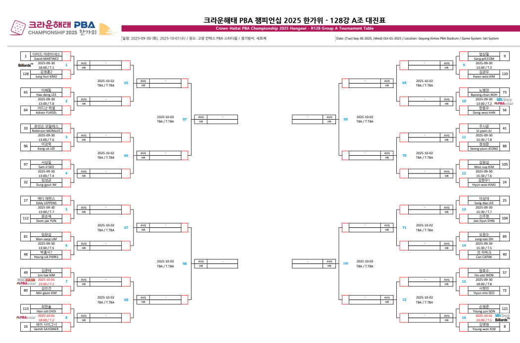 크라운해태 PBA 챔피언십 2025 한가위 챔피언십 128강 A조 대진표