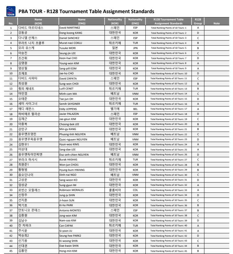 크라운해태 PBA 챔피언십 2025 한가위 128강 대진표 결정을 위해서는 최근 10개 투어 성적에 따른 랭킹을 바탕으로 조별 그룹을 정합니다.