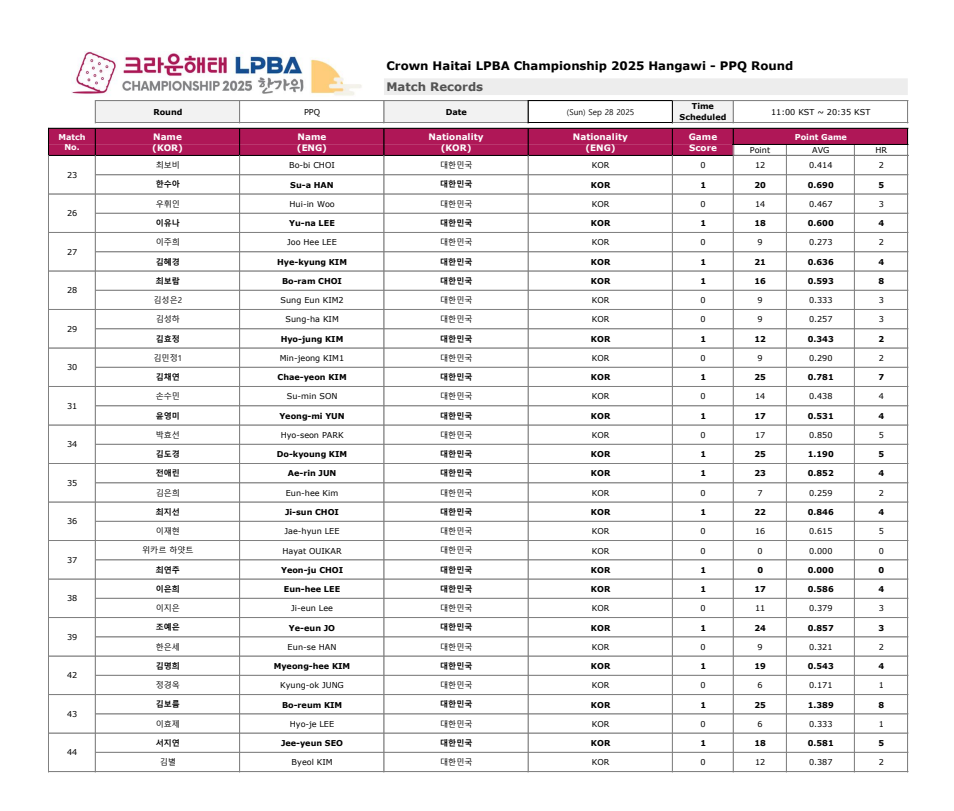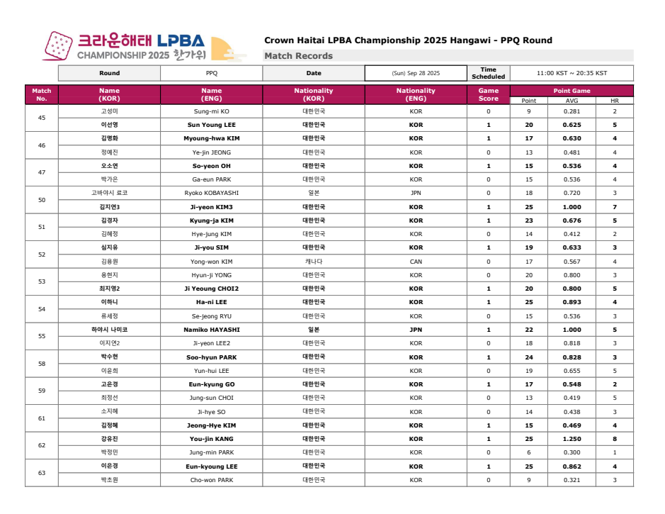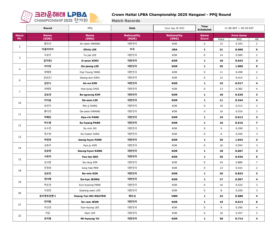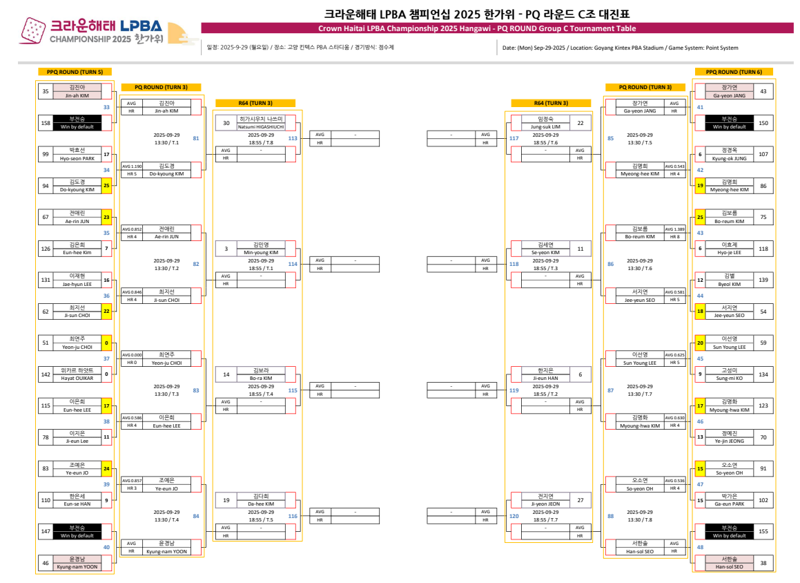 크라운해태 PBA 챔피언십 2025 한가위 PQ 라운드 대진표 - PPQ 경기결과