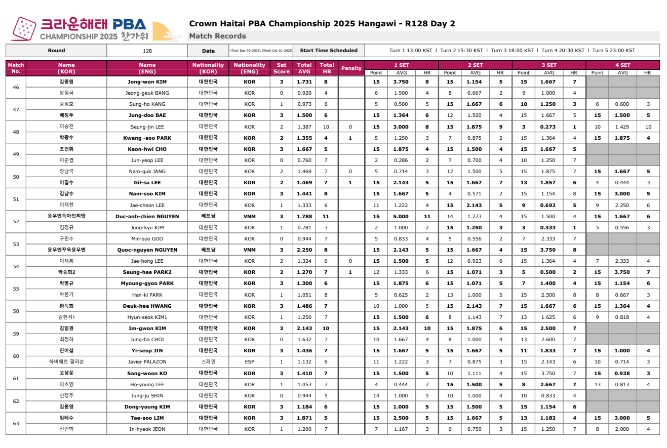 한편 크라운해태 PBA 챔피언십 2025 한가위 128강 경기는 10월 1일과 2일 양일간에 걸쳐서 펼쳐졌으며, 유명한 팔라손, 최성원 등 PBA 챔피언 출신이 128강에서 와일드 카드 신예들에게 무릅을 꿇었습니다.