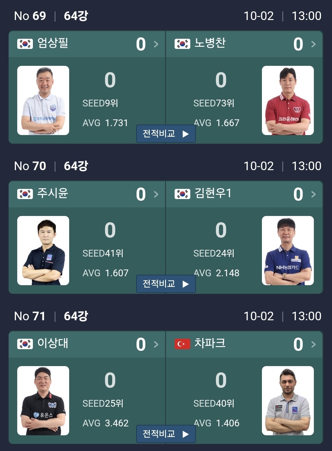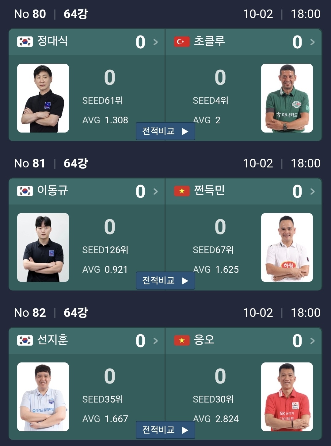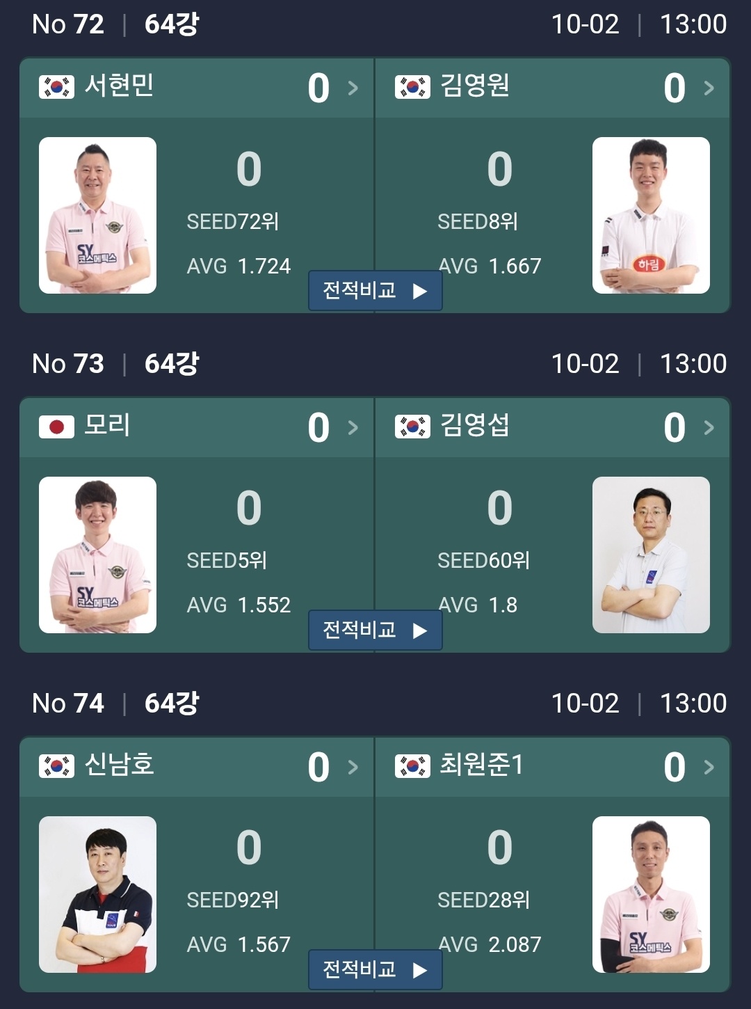 신남호는 최원준과 강민구는 우태하와 박인수는 이영민 선수와 경기를 펼칩니다. 체네트는 최명진과 권혁민은 이충북 선수와 64강 경기를 예약하고 있습니다.
