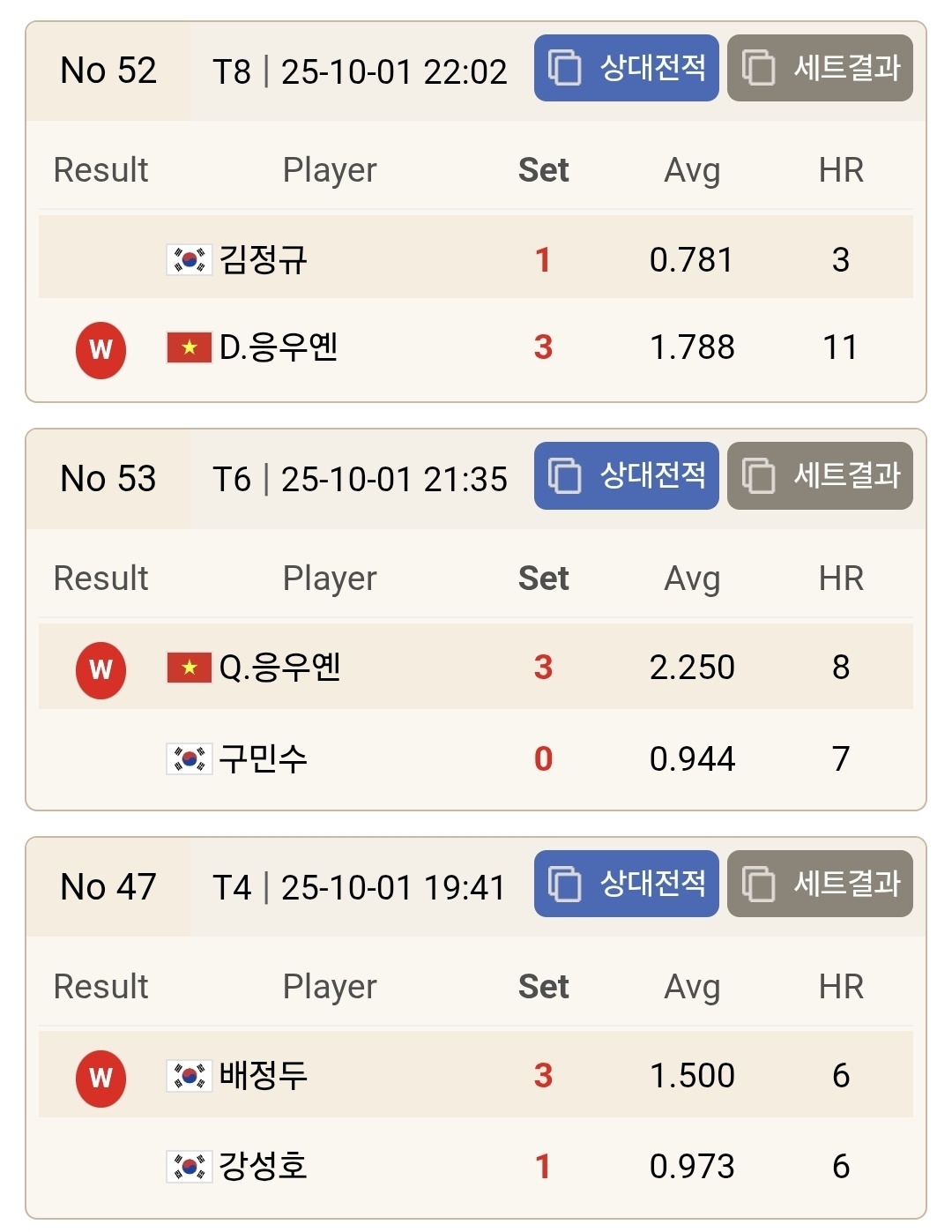 응웅녜 득아이찌엔과 꾸억 응우옌도 김남수와 박승희와 경기를 펼칩니다. 이번 대회에는 베트남 당구선수가 모두 64강에 진출한 것 같습니다. 베트남 출신 최초의 PBA 챔피언인  마민껌 선수는 탈락했군요.