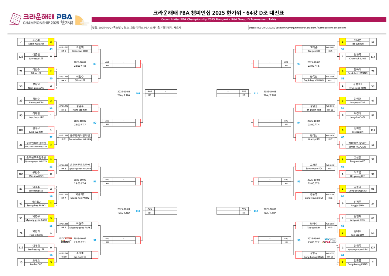 오늘은 크라운해태 PBA 챔피언십 2025 한가위 128강 경기결과에따른 64강 대진표 최종 자료를  정리하였습니다.
