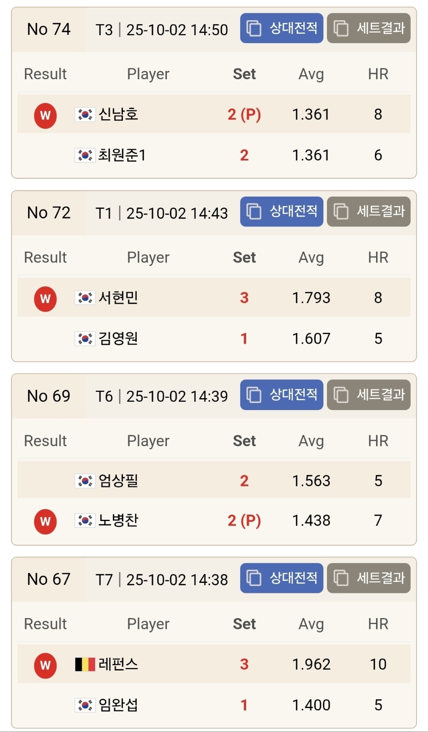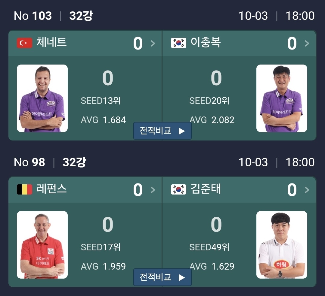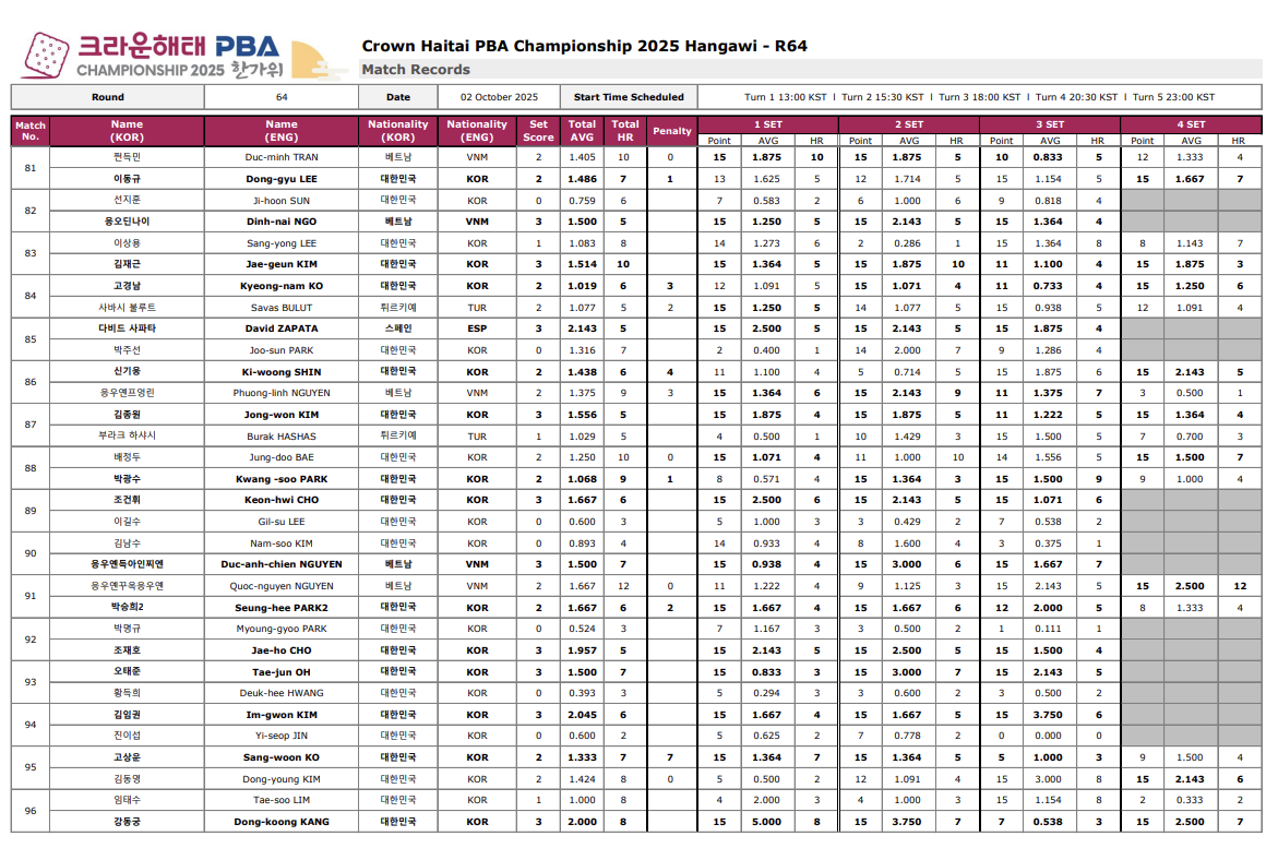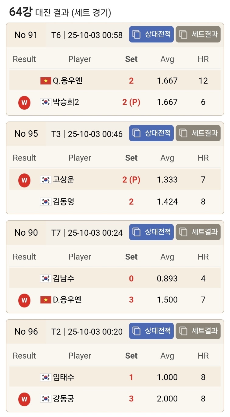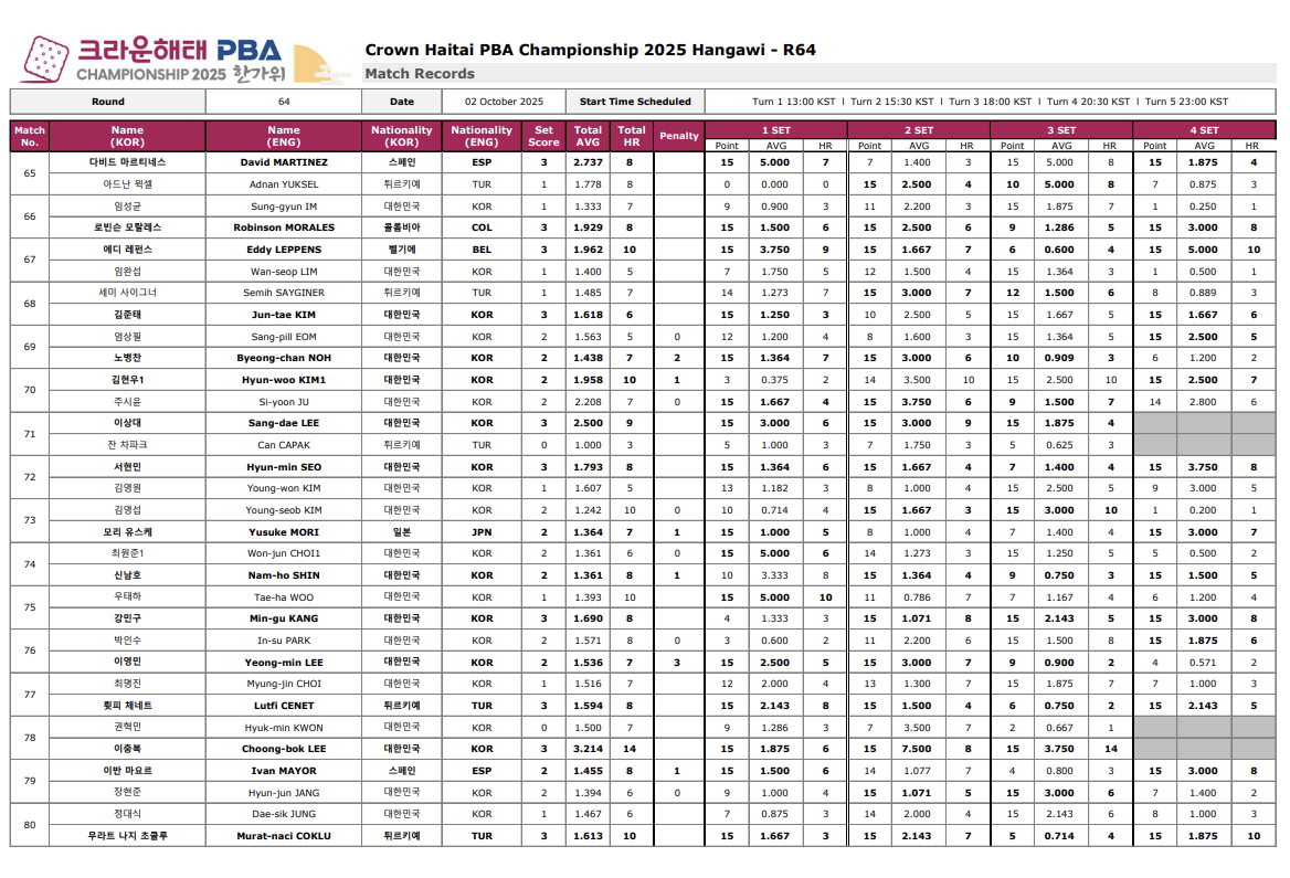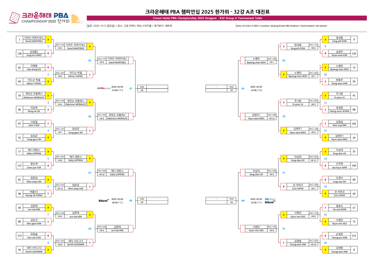 그럼 지금부터 크라운해태 PBA 챔피언십 2025 한가위 32강 대진표를 보기에 앞서 64강 경기결과를 먼저 살펴보겠습니다.