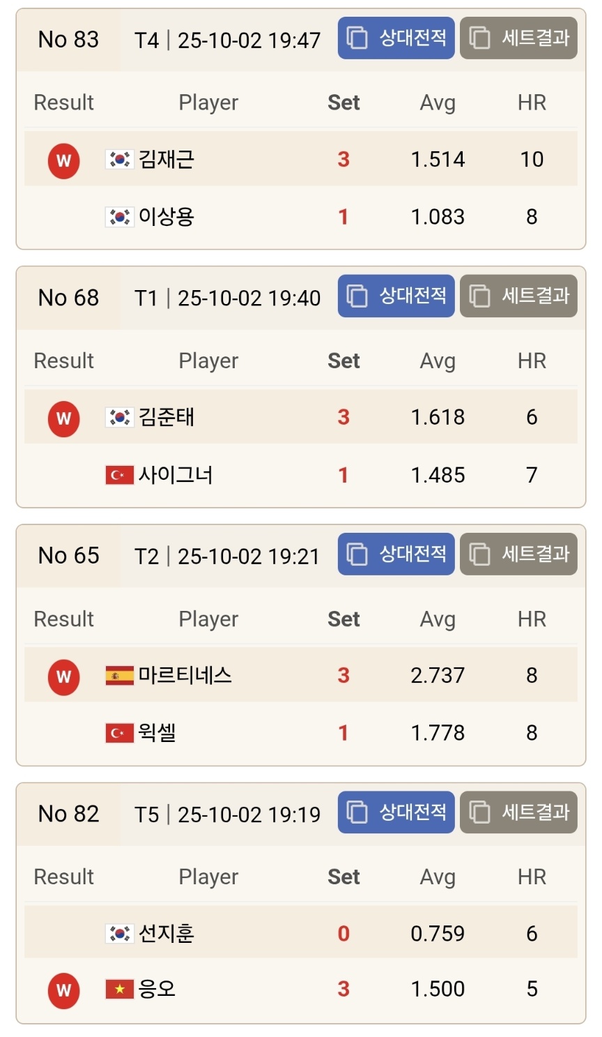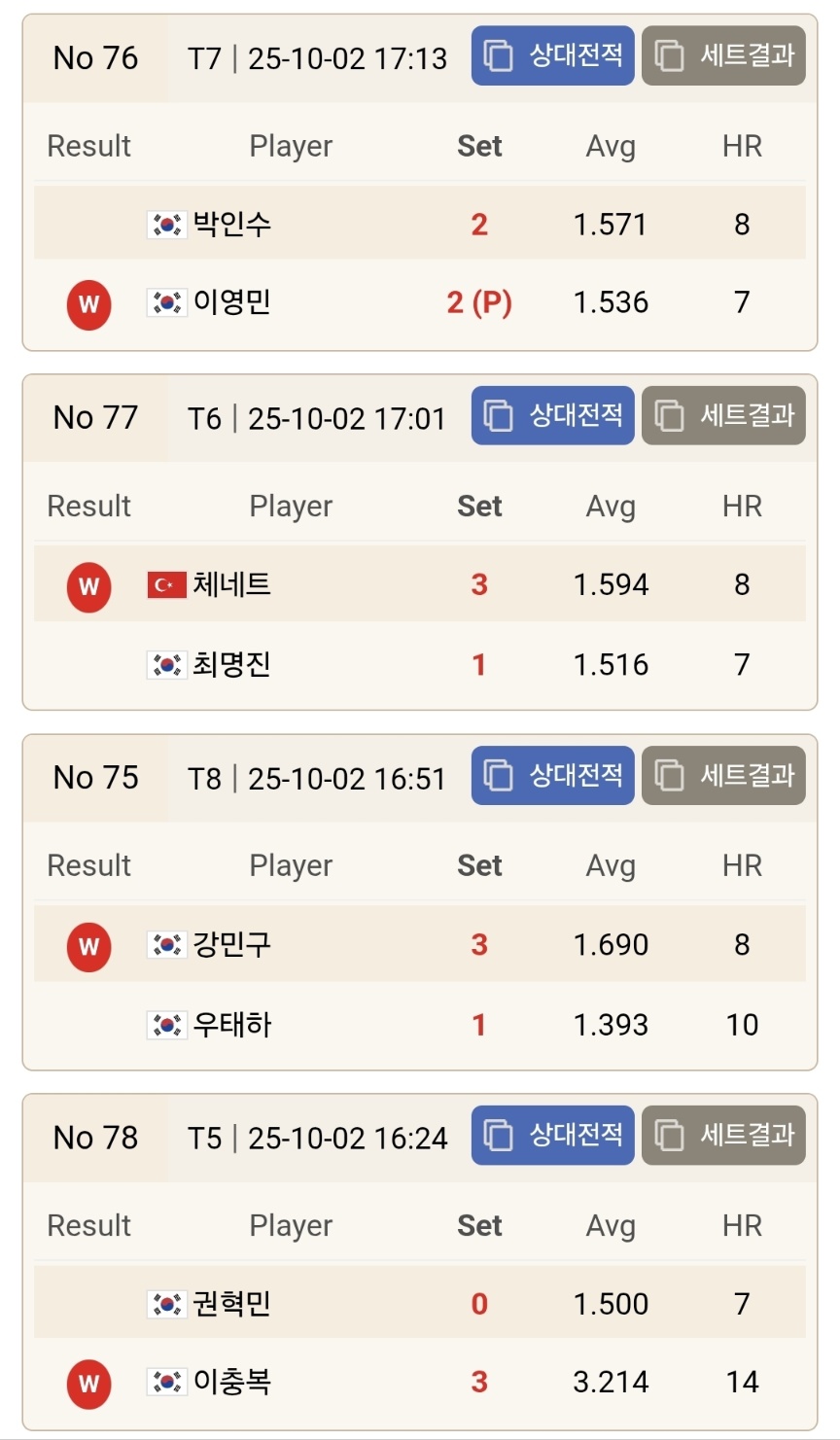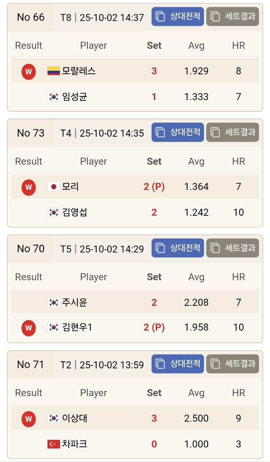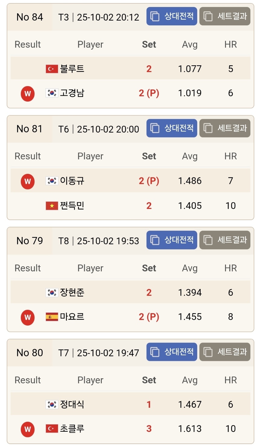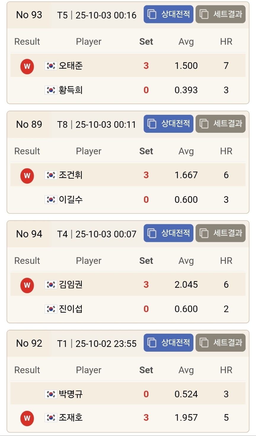 그럼 지금부터 크라운해태 PBA 챔피언십 2025 한가위 32강 대진표를 보기에 앞서 64강 경기결과를 먼저 살펴보겠습니다.