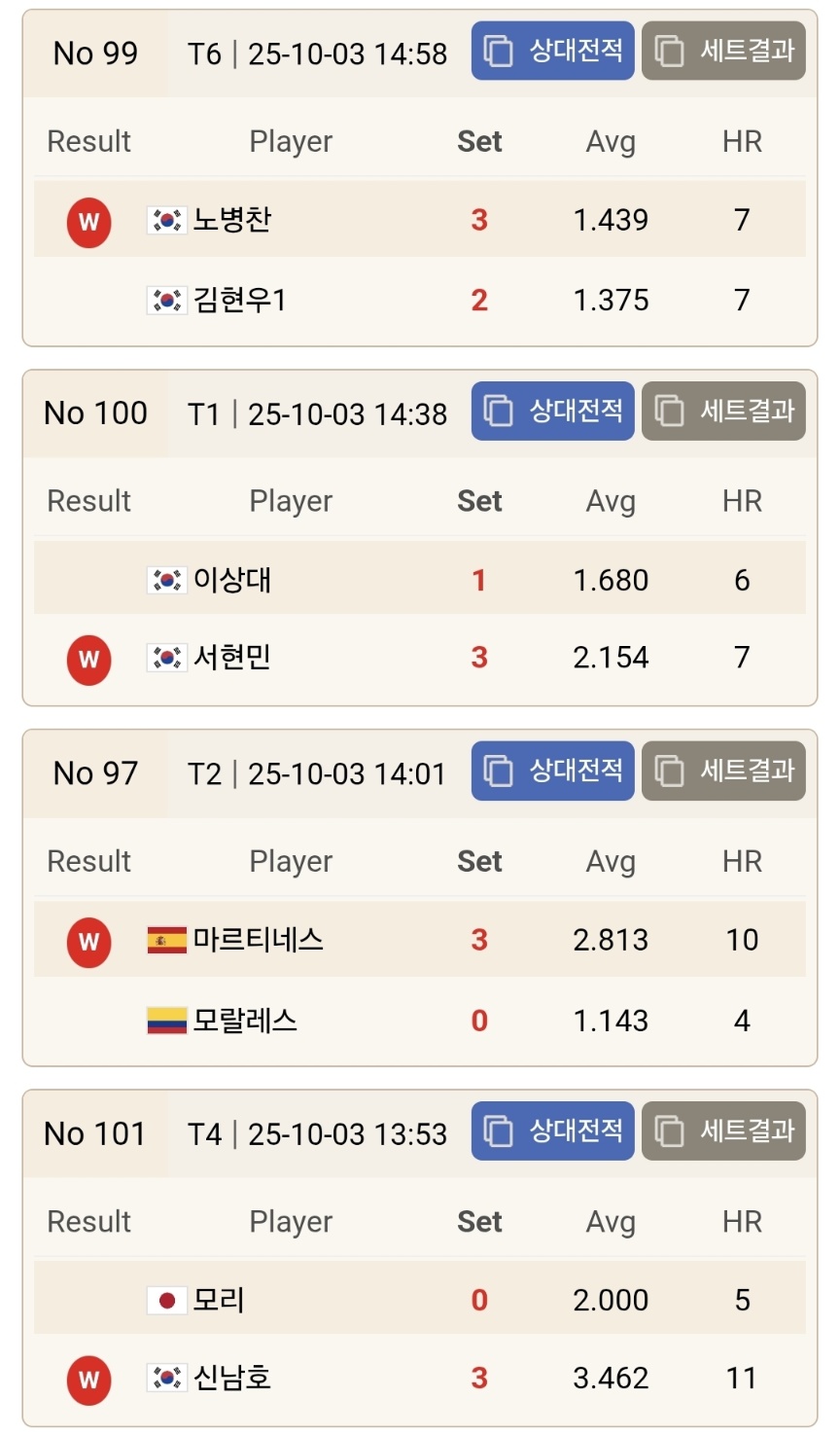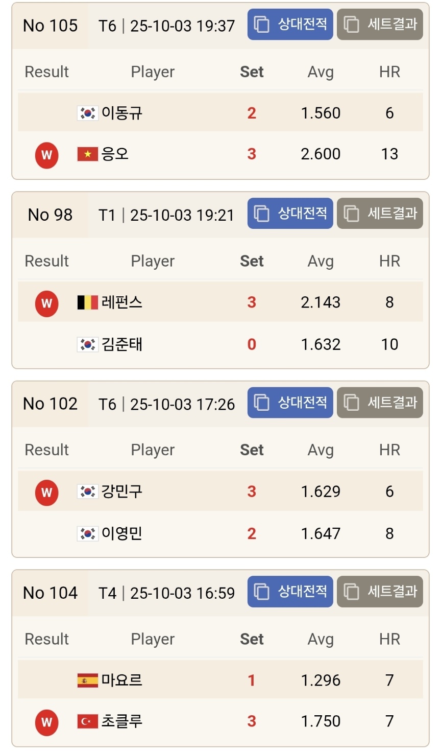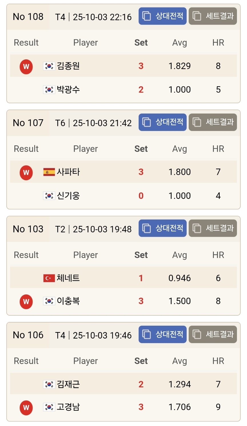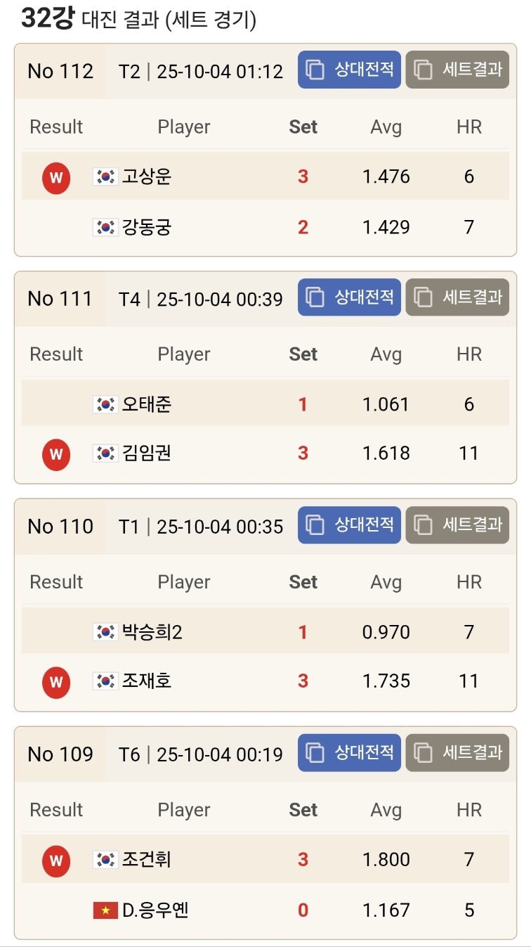 그럼 지금부터 크라운해태 PBA 챔피언십 2025 한가위 16강 대진표를 보기에 앞서 32강 경기결과를 먼저 살펴보겠습니다.
