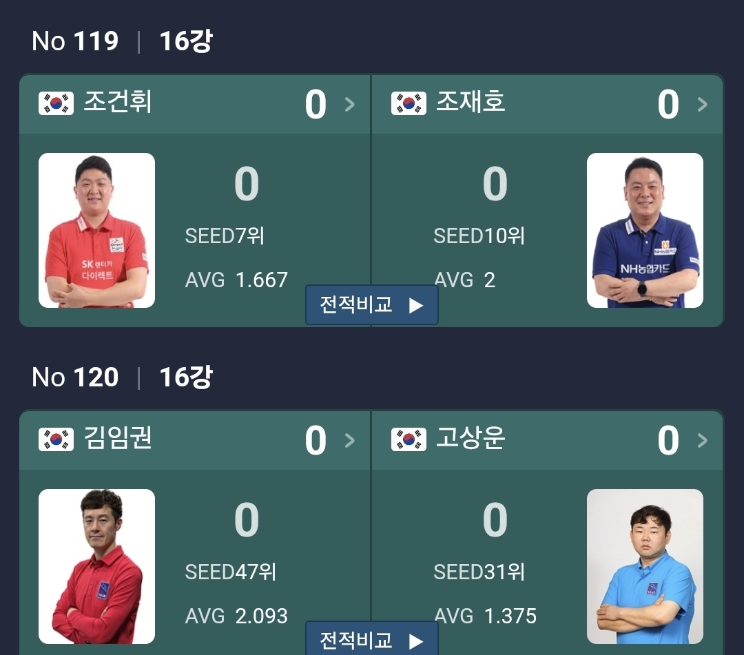 김임권, 고상운, 노병찬, 고경남, 신남호, 이충복, 김종원 선수 더 분발해서 상금이 더 많은 다음 라운드로 진출하면 좋겠습니다. 일단 4강 준결승에 진출을해야 상금 1천만원을 확보하게 됩니다.