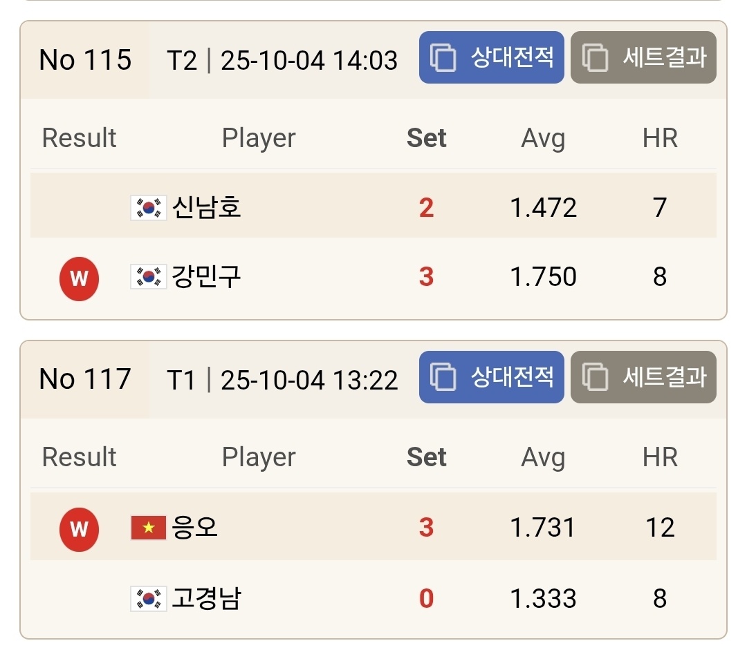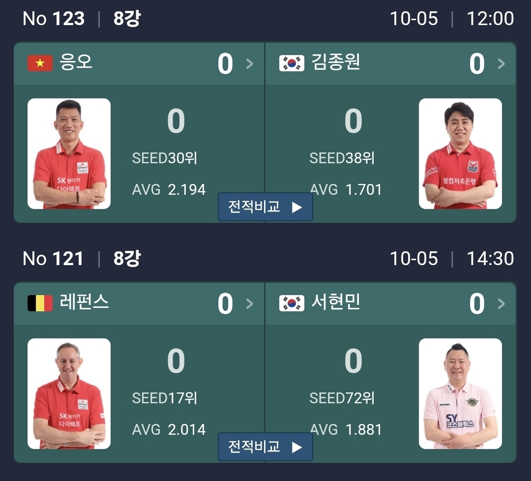 그러고 보니, PBA 챔피언 출신 4명 VS 비챔피언 4명의 대결이기도합니다. PBA 프로당구 무대를 주름 잡았던 스페인 당구선수들이 우수수 탈락을 하고 벨기에와 베트남 당구선수 각각 1명씩만 살아 남았습니다.