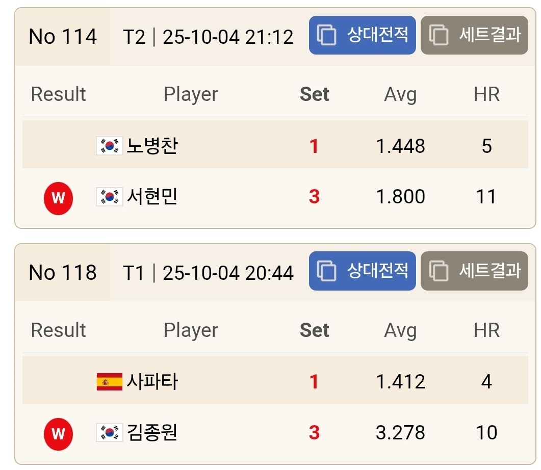 스페인 강호 2명이 동시세 탈락한 것은 큰 이변이라 할 수 있습니다. 다비드 사파타가 애버 1.412를 친 반면, 김종원 선수는 3.278을 기록하면서 애버리지 웰뱅 톱랭킹도 갈아 치웠습니다.